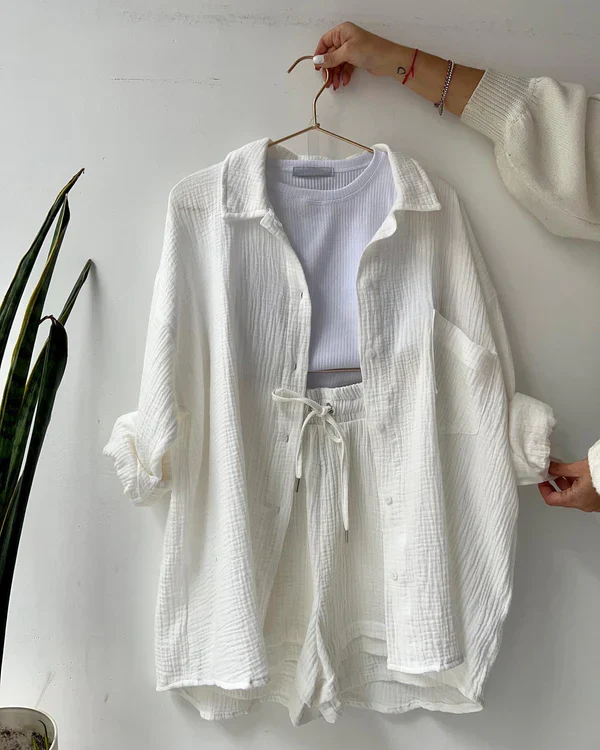 Notre ensemble deux pièces plissé Albina- Solid est parfait pour celles qui apprécient le confort sans sacrifier le style. Fabriqué à partir de matériaux de haute qualité, cet ensemble décontracté vous gardera au frais et détendu toute la journée. Le haut à col rabattu ajoute une touche d’élégance à l’ensemble, tandis que le short a une ambiance ludique qui va bien avec l’été.