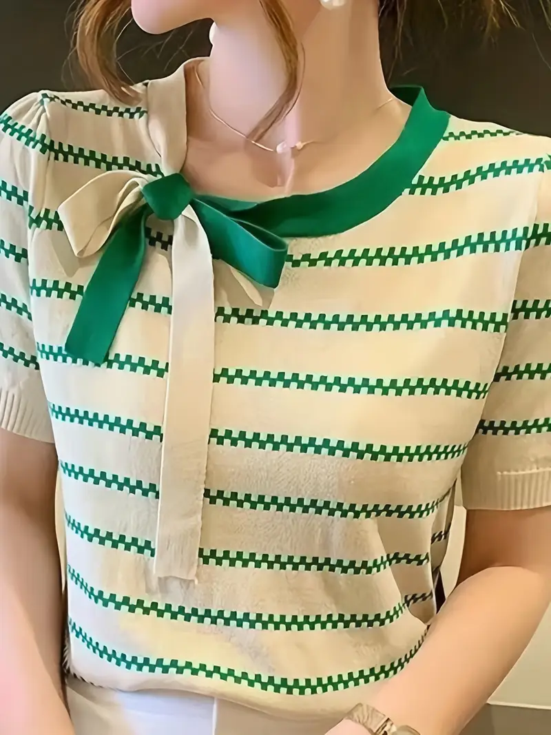 Ajoutez une touche d’élégance ludique à votre garde-robe avec ce haut décontracté en tricot à col polo et lien à nouer pour femme. Ce haut allie charme sportif et sophistication. Il arbore un col polo classique, des rayures élégantes et une encolure nouée unique qui sublime le look. Confectionné en maille douce et extensible, il allie confort et style.