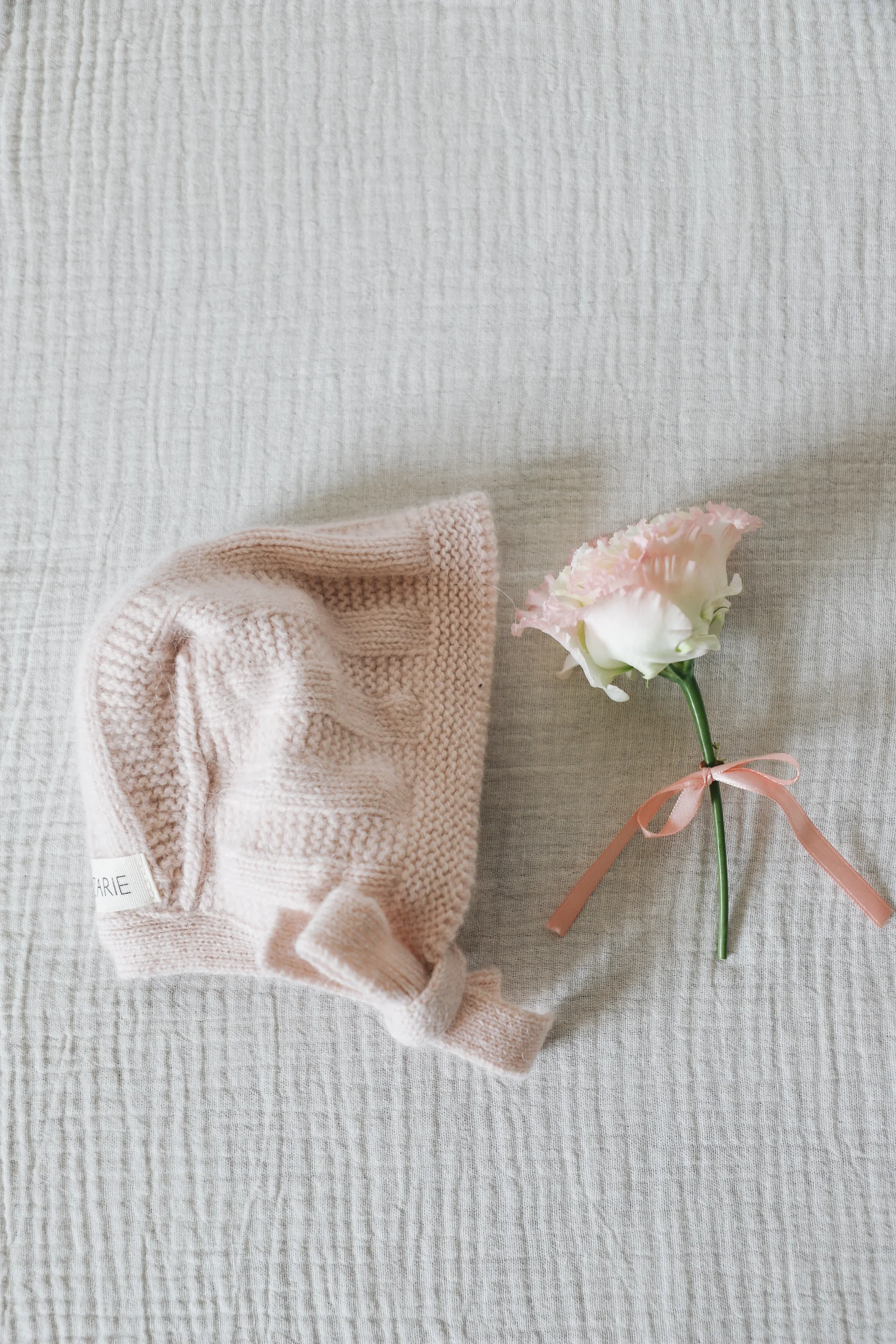 Béguin avec de la laine YSEE – Rose dragée – tricoté en France