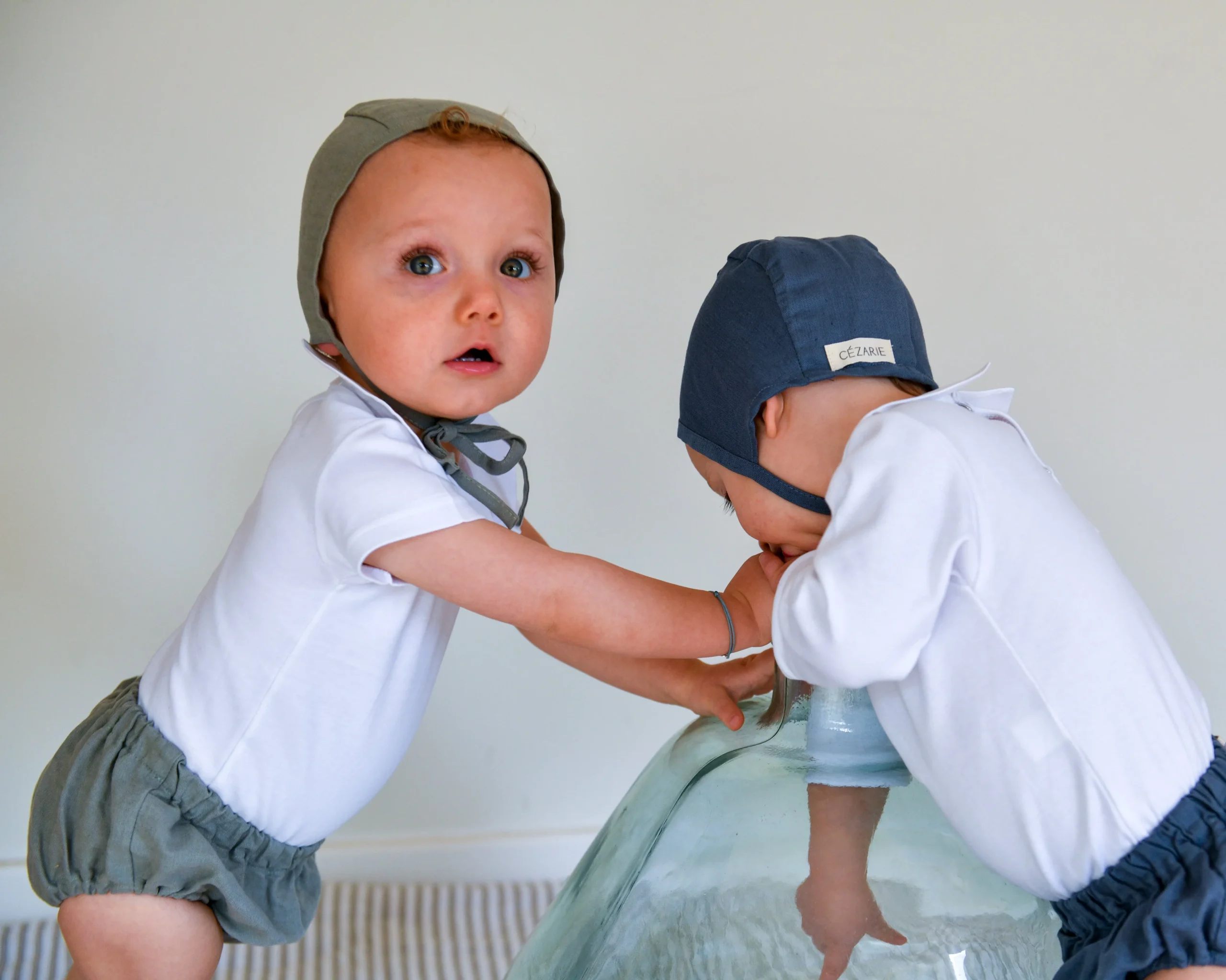 Le béguin PÉPIN est un modèle iconique CÉZARIE. La coupe de notre béguin a été soigneusement étudiée pour mettre en valeur les traits du visage de votre enfant et le protéger du soleil et du vent.