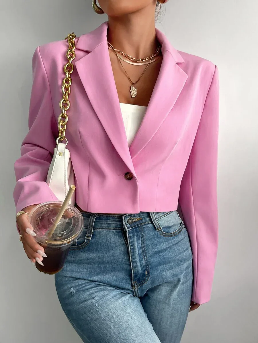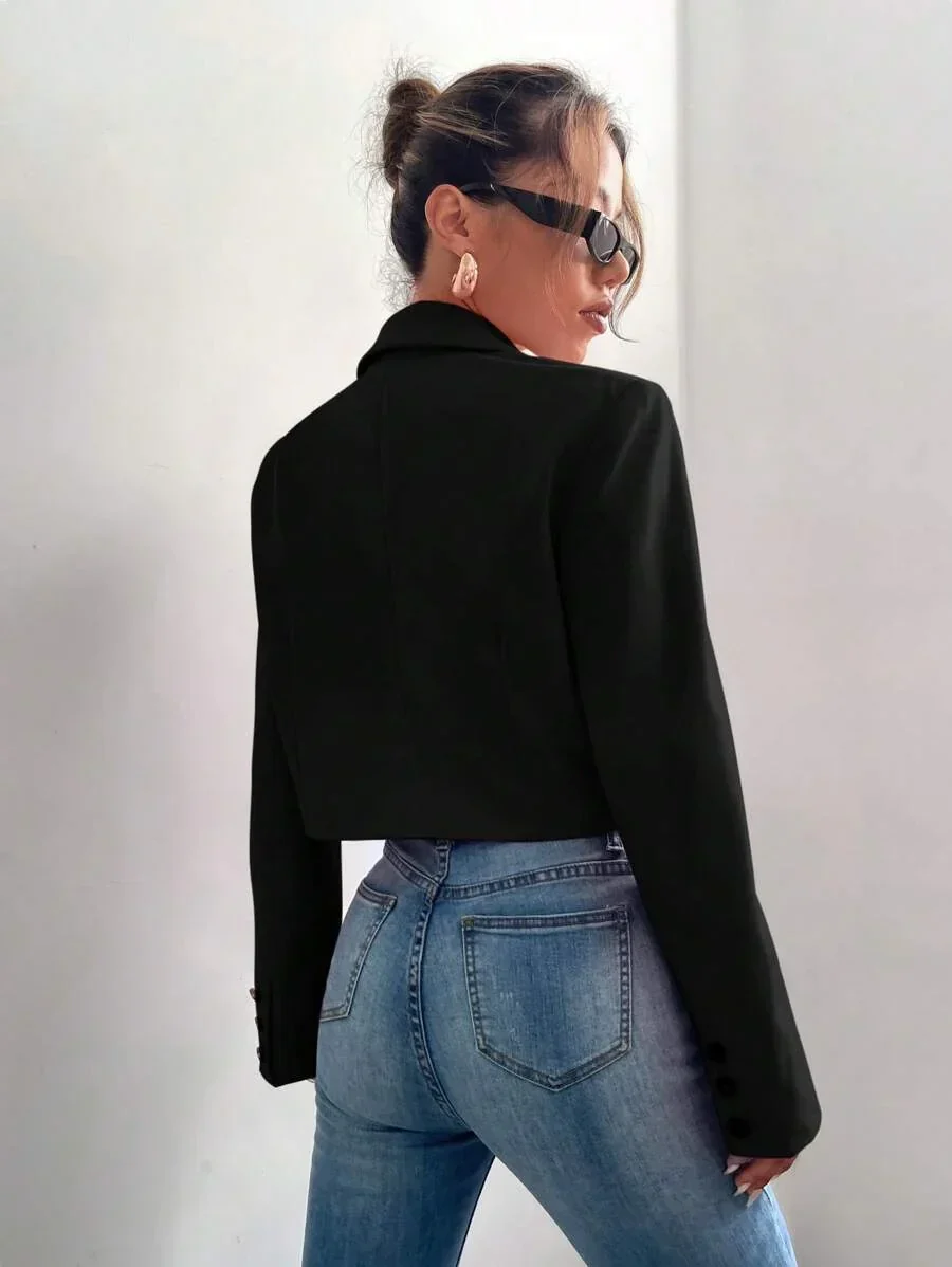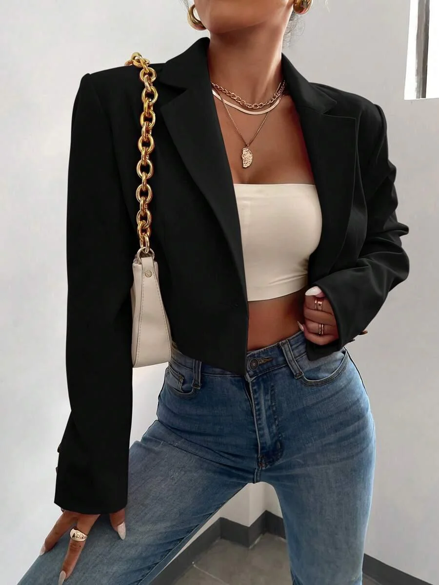 Élégance intemporelle dans un blazer à revers. Fabriqué en luxe tranquille tissu tissé de luxe, la silhouette courte offre mode minimaliste Séduction assurée. Le revers classique encadre l’encolure, et une fermeture à un seul bouton assure une silhouette épurée. Le corps est doublé noir pour une coupe fluide et structurée.
