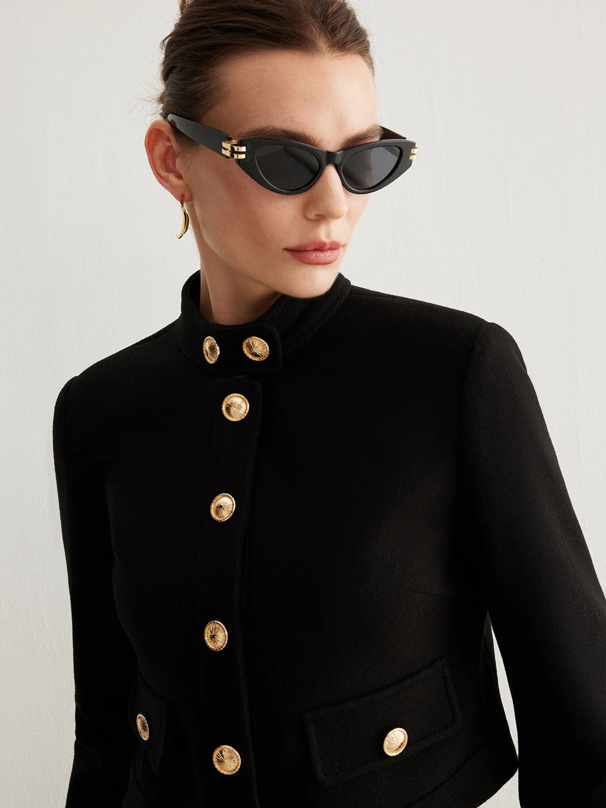 Ce blazer court noir avec ses boutons dorés est le choix parfait pour un look sophistiqué et audacieux. Son design structuré et son col officier ajoutent une touche royale et moderne à toutes vos tenues.