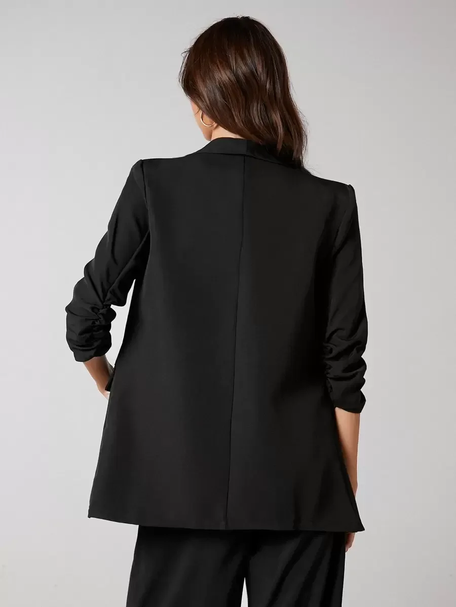Blazer élégant aux manches volantées et au col châle, il respire l’élégance intemporelle. D’un noir classique, ses lignes minimalistes incarnent un luxe discret et un chic naturel. De subtils fronces apportent de la texture sans surcharger la silhouette épurée. Non doublé pour un effet drapé léger, il présente un ourlet et une longueur standard pour une superposition polyvalente.