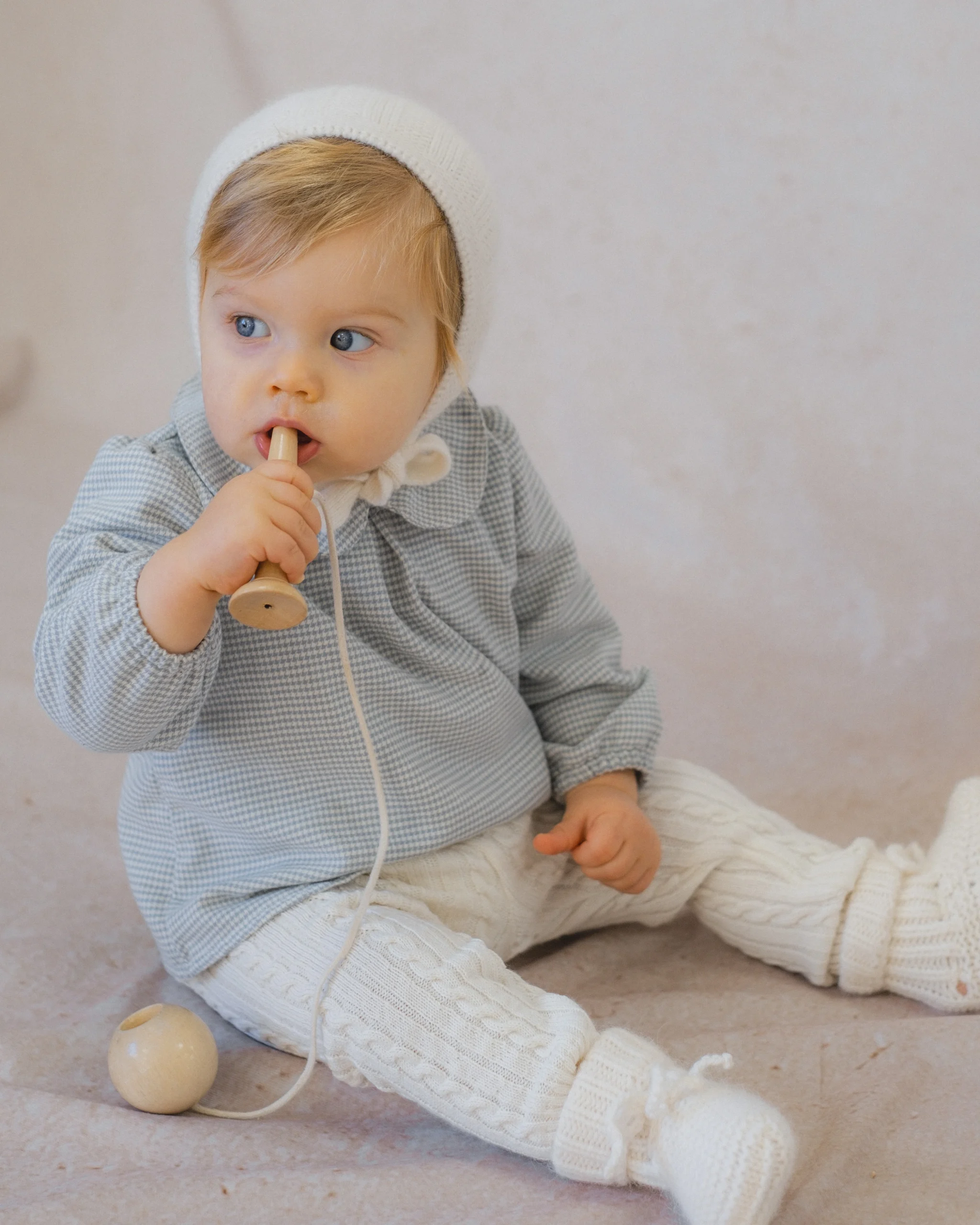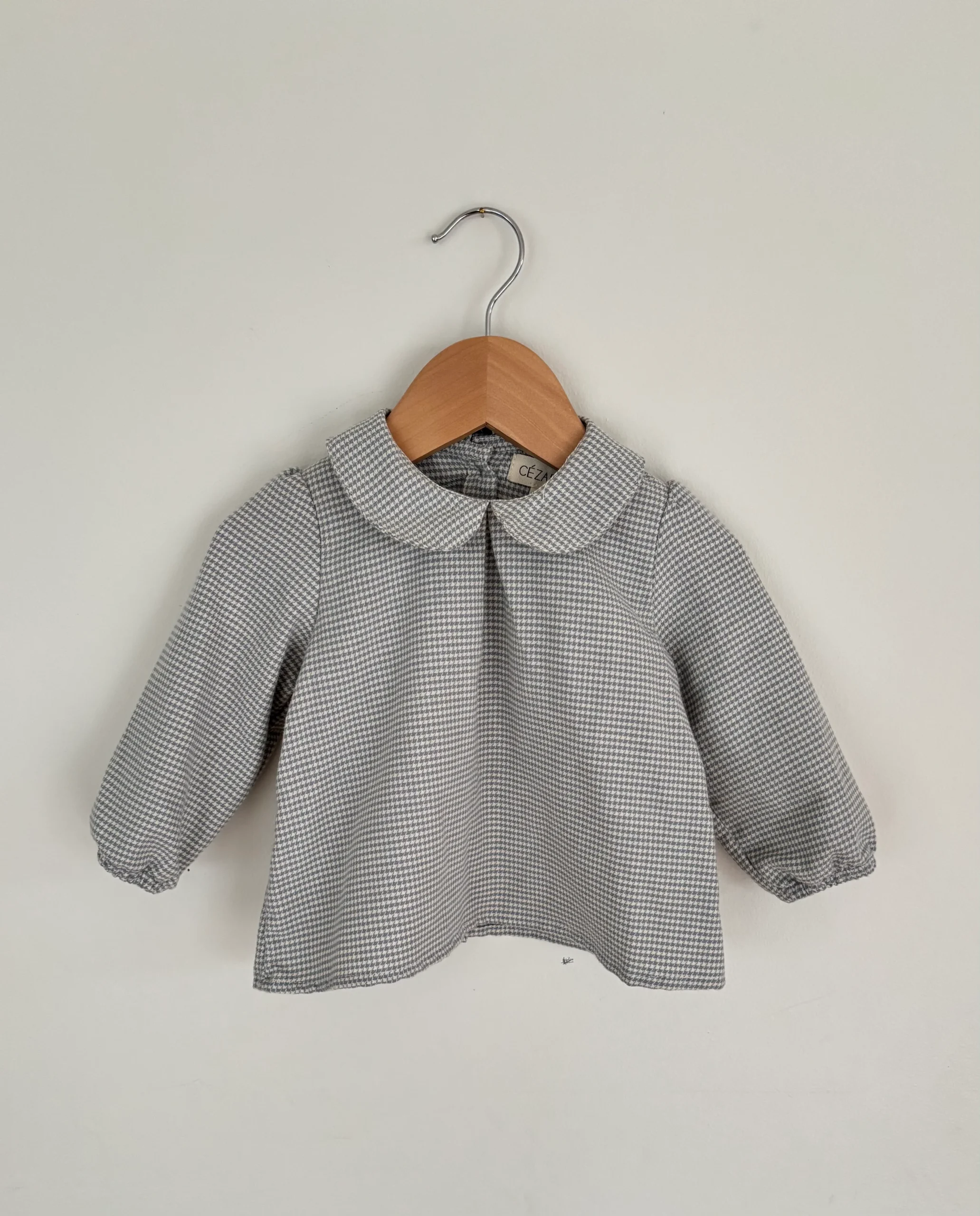 Impossible de résister à cette petite blouse pour bébé au charme rétro et chic ! Avec son col claudine délicat, son élégant tissage pied-de-poule disponible en caramel ou bleu, et ses petites manches légèrement froncées, elle est tout simplement parfaite. Les bas de manches élastiqués assurent confort et praticité, tandis que la boutonnière dans le dos ajoute une touche raffinée et facilite l’habillage.