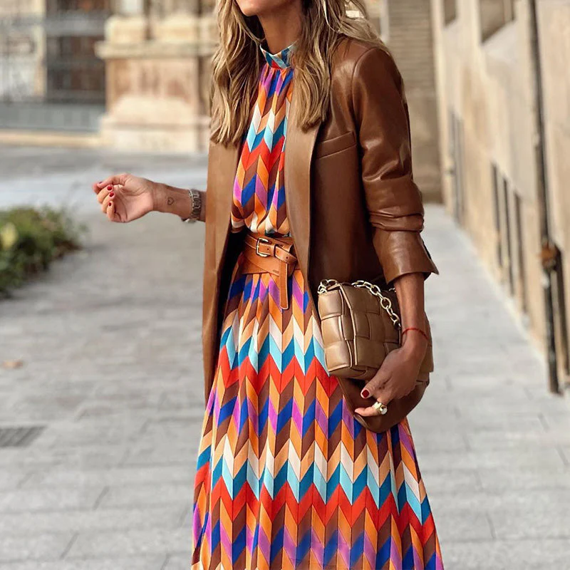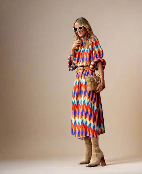 Cette robe midi à imprimé graphique multicolore attire tous les regards grâce à ses teintes dynamiques et sa coupe flatteuse. Légèrement évasée et ceinturée à la taille, elle met en valeur la silhouette tout en assurant liberté de mouvement.
