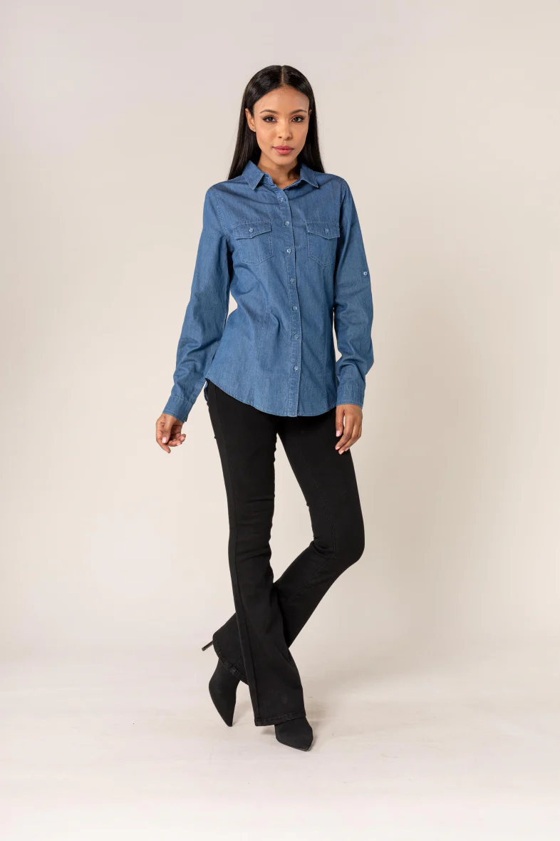 Chemise en coton basique, look denim, cintrée.