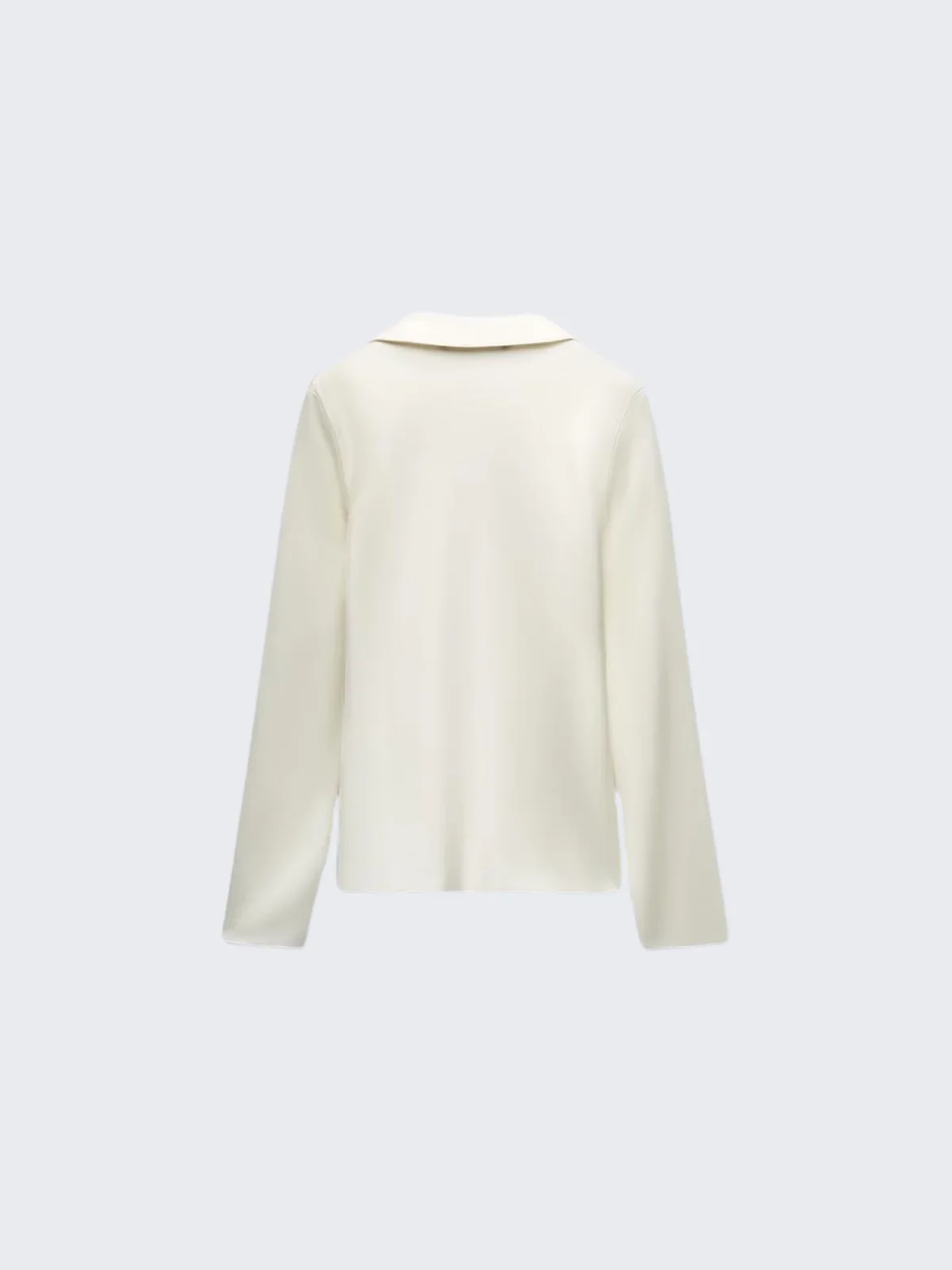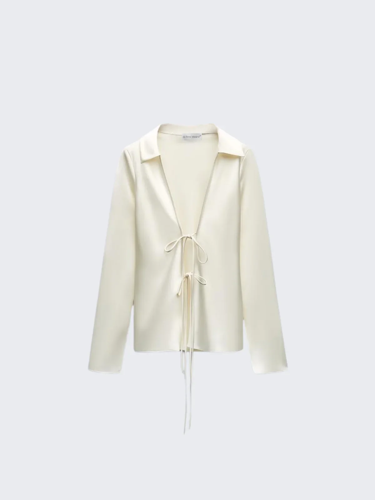 Conception: Une chemise chic et féminine avec une douce teinte ivoire, des manches longues et un élégant détail de cravate sur le devant qui ajoute une touche de charme sans effort à sa silhouette minimaliste.