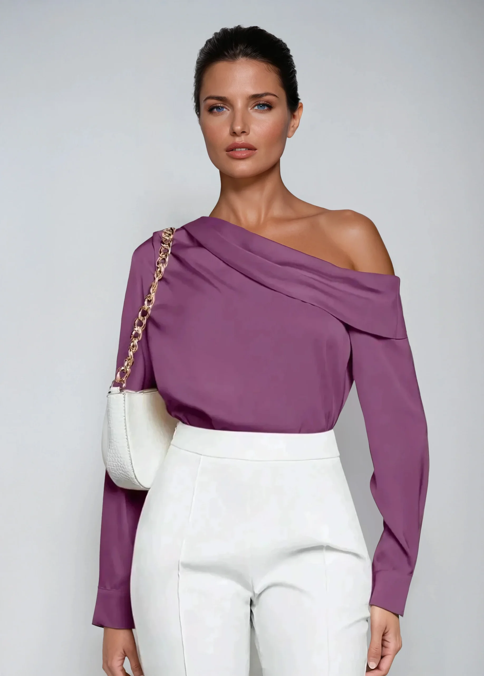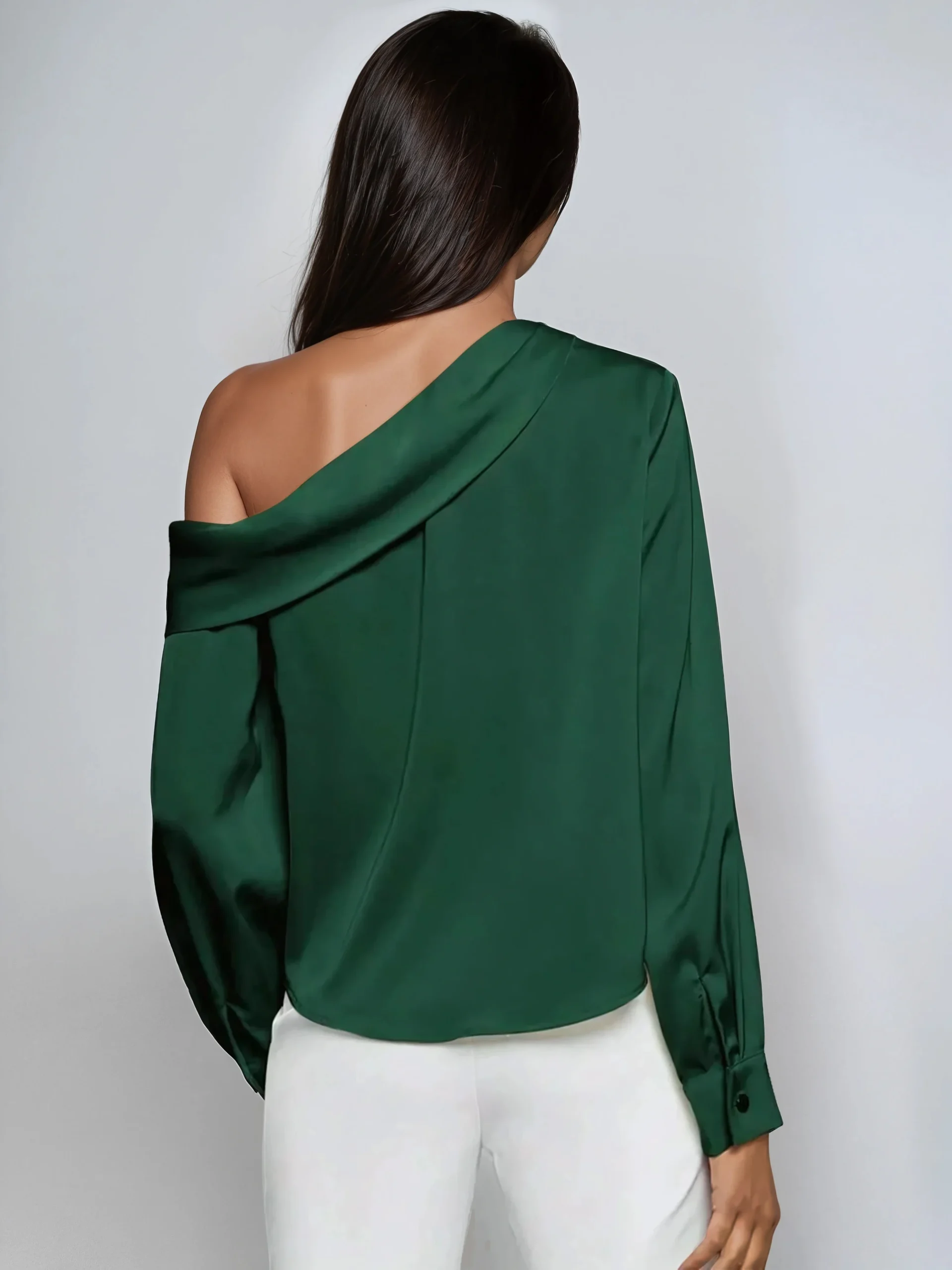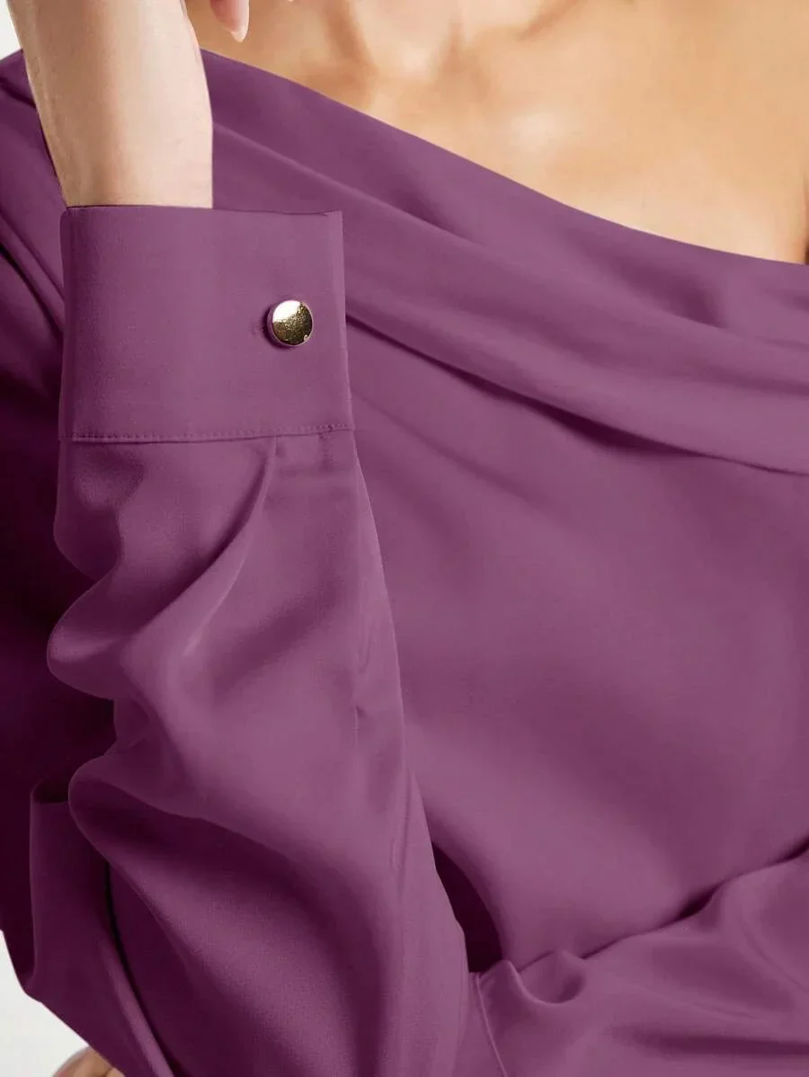 Le chemisier présente une silhouette drapée et froncée qui bouge avec une confiance tranquille. cou asymétrique ajoute une touche moderne, tandis que détails du bouton et une surface lisse et satinée conservent un aspect raffiné.