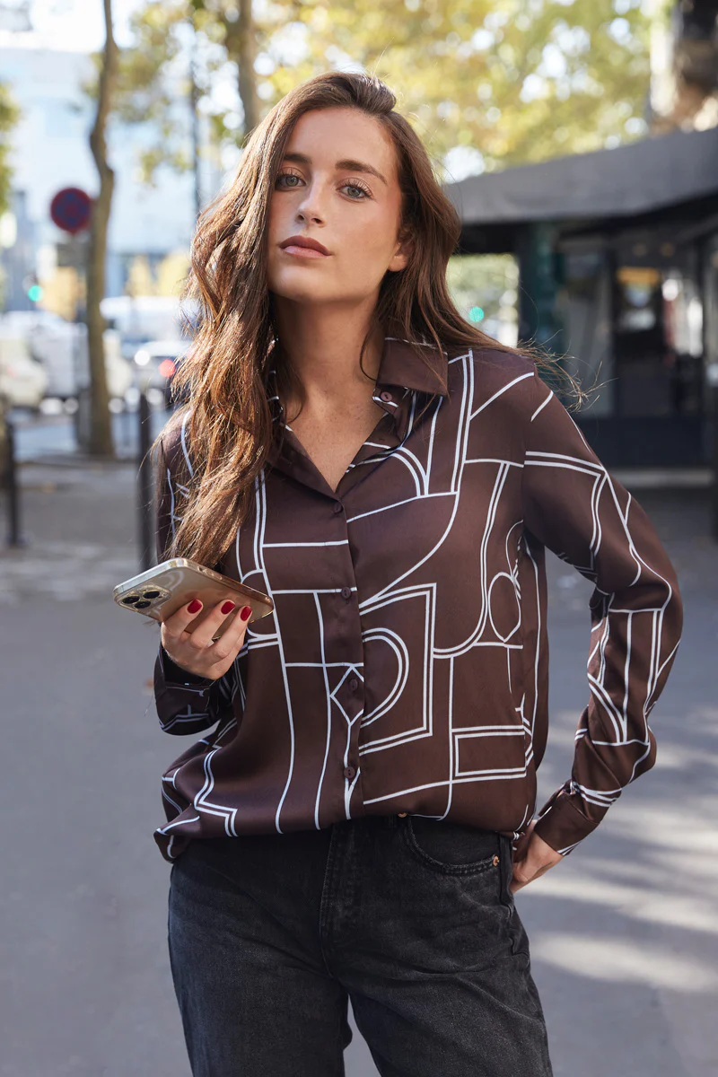 Ce chemisier à l’imprimé géométrique audacieux revisite le classique du vestiaire féminin avec style et modernité. Confectionnée dans un tissu fluide et légèrement satiné, il offre un tombé élégant. Son col classique et sa coupe droite en font une pièce facile à porter, aussi bien pour un look de bureau que pour une tenue plus habillée.