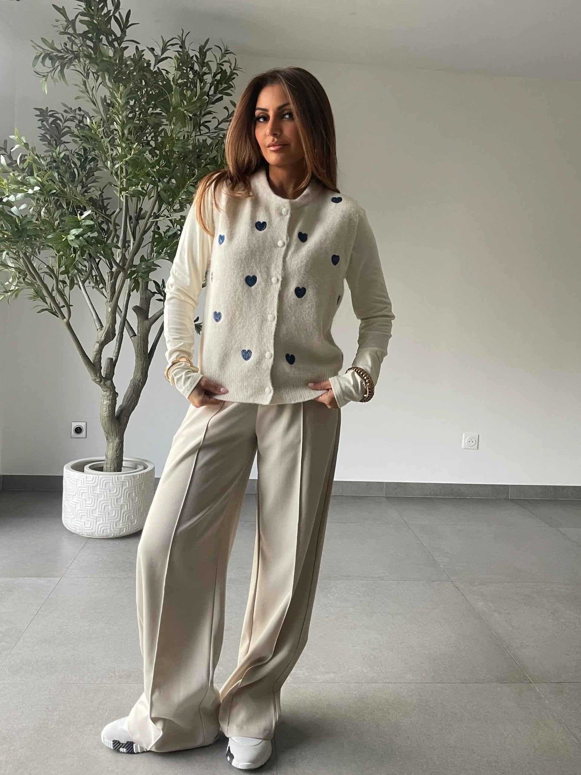 Gilet sans manches blanche, style romantique et graphique Motif cœur bleu, apportant une touche originale et féminine Modèle à boutonner, pour un enfilage facile et structurer la silhouette Coupe droite et fluide, idéale pour un look casual chic ou superposé sur une blouse Tissu agréable et léger, parfait pour la mi-saison
