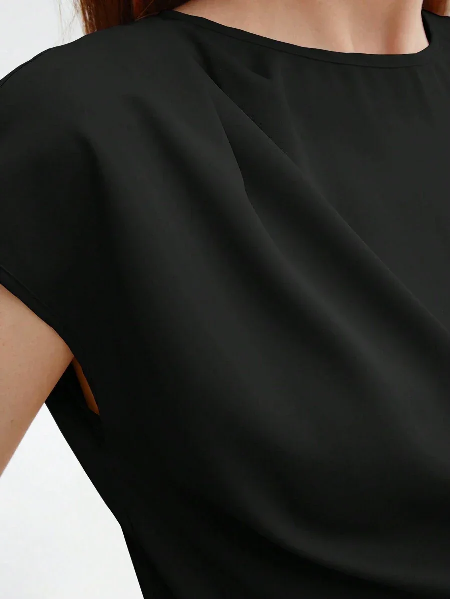 Un haut à col rond avec des détails délicats à volants et des manches bouffantes douces crée un look élégance intemporelle et luxe tranquille. La palette noire unie incarne mode minimaliste À son meilleur, tandis que de subtils fronces ajoutent de la texture sans écraser les lignes épurées. Non doublée pour un drapé léger et polyvalent, cette pièce incarne style argent ancien sensibilités et sophistication raffinée.