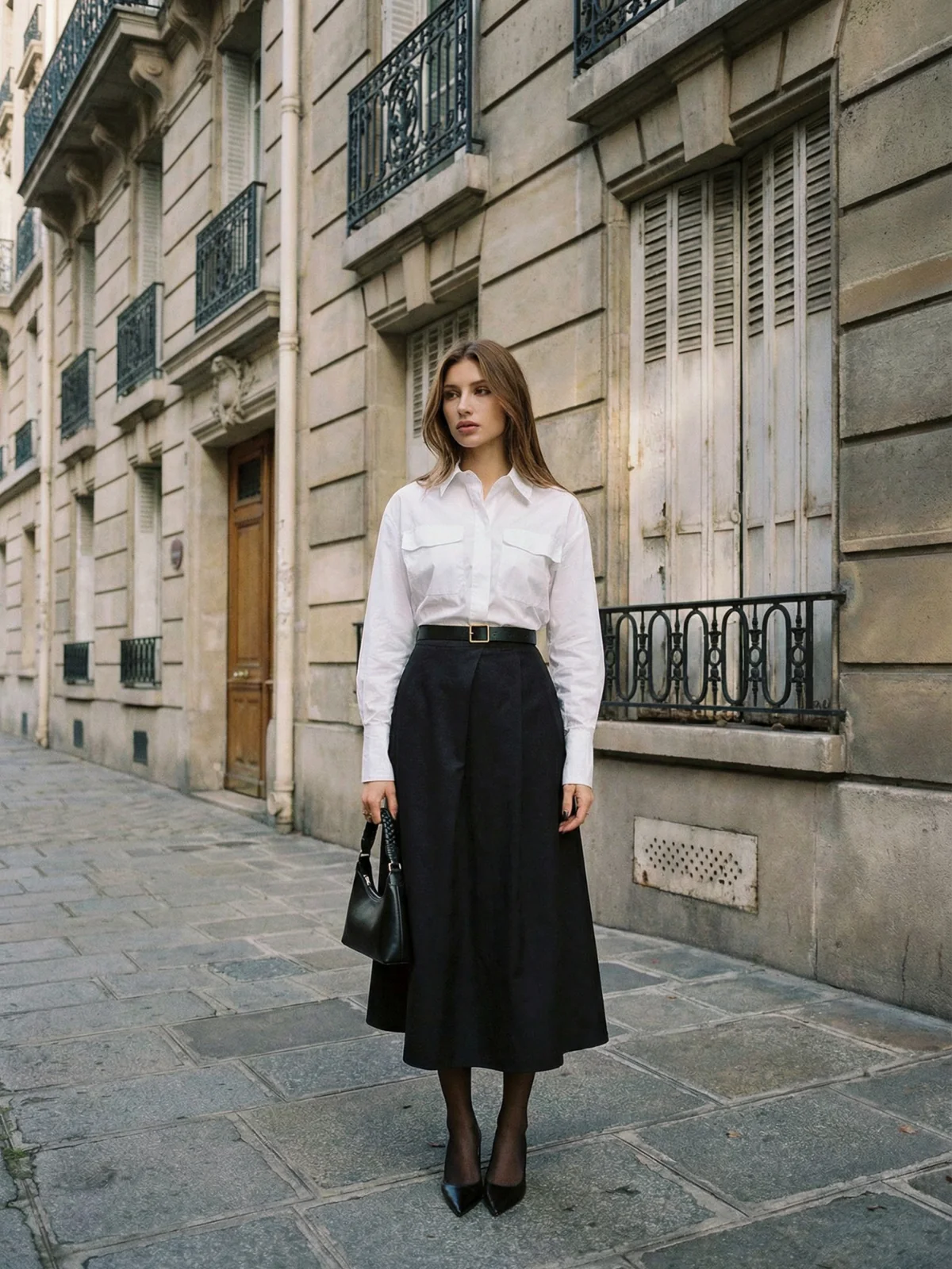 Jupe longue noire à boutons et poches avant, idéale pour le bureau et les tenues d’automne élégantes pour femmes actives.
