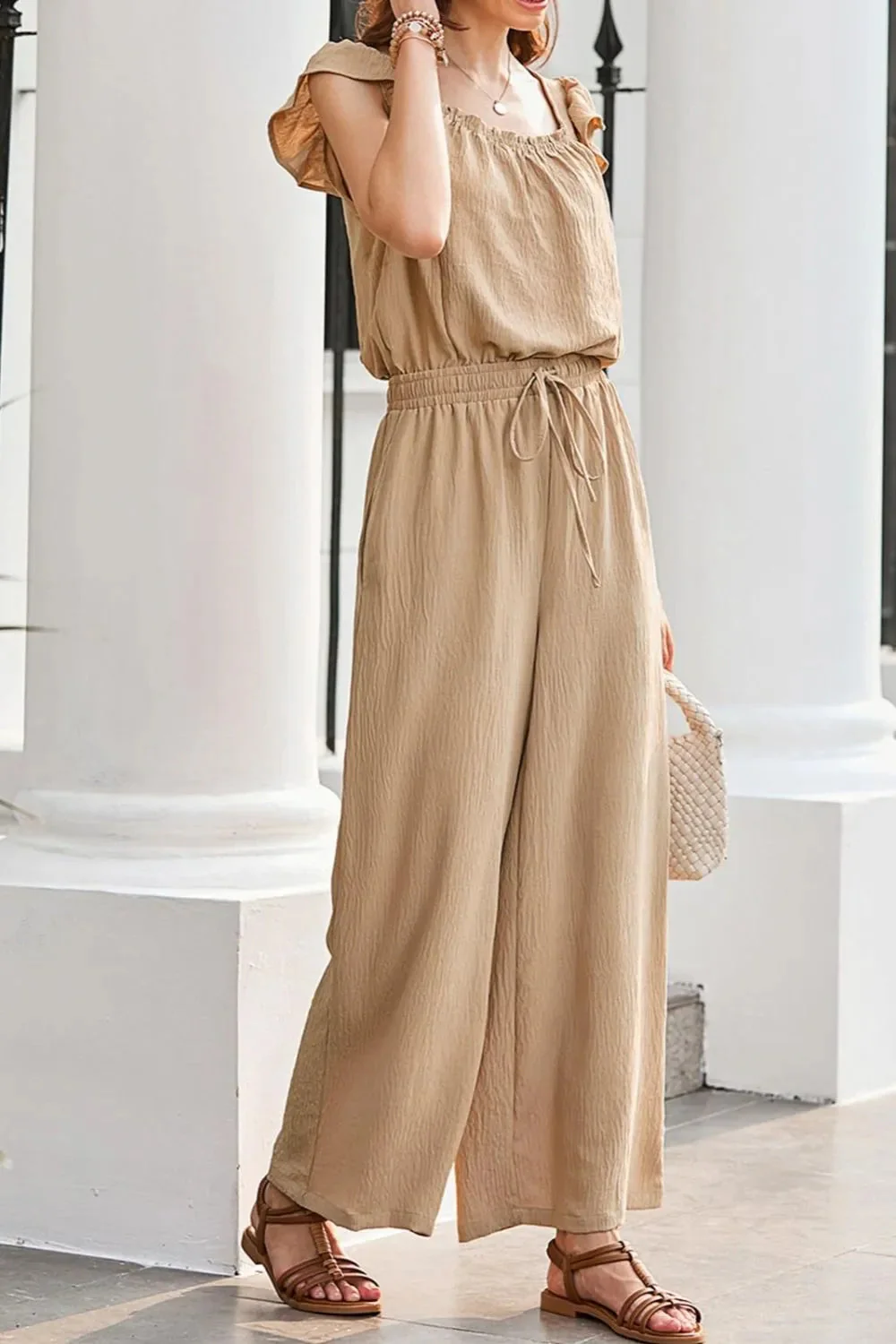 Vous cherchez le parfait mélange entre confort et style ? Cette combinaison décontractée avec manches volantées et jambe large a tout : fraîcheur, élégance et une silhouette flatteuse. Parfaite pour une journée de courses ou un déjeuner entre amies, elle offre un look chic et détendu en un instant. Les volants féminins ajoutent une touche délicate et charmante.