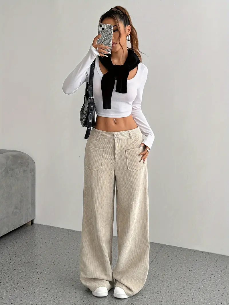 Le pantalon à jambes larges en velours côtelé pour femmes offre un équilibre parfait entre confort et style. Fabriqué en velours côtelé doux et résistant, ce pantalon a une coupe décontractée à jambe large qui offre un confort tout au long de la journée et une silhouette flatteuse. La texture riche du velours côtelé ajoute une touche de sophistication, faisant de ce pantalon un complément polyvalent à toute garde-robe décontractée.