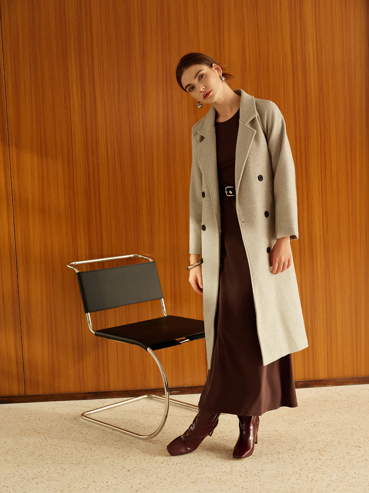 Ce manteau long à double boutonnage en laine beige est un indispensable pour des journées fraîches tout en restant sophistiquée. Sa coupe classique flatte toutes les silhouettes, et ses détails raffinés ajoutent une touche intemporelle à votre garde-robe.
