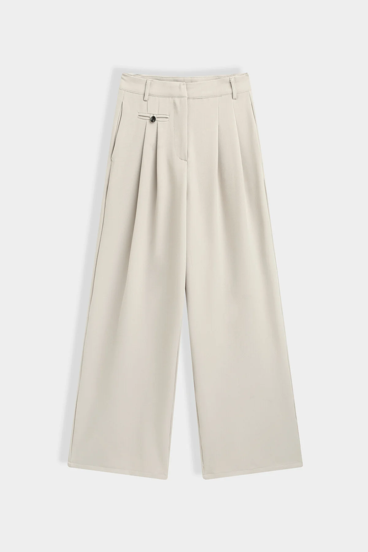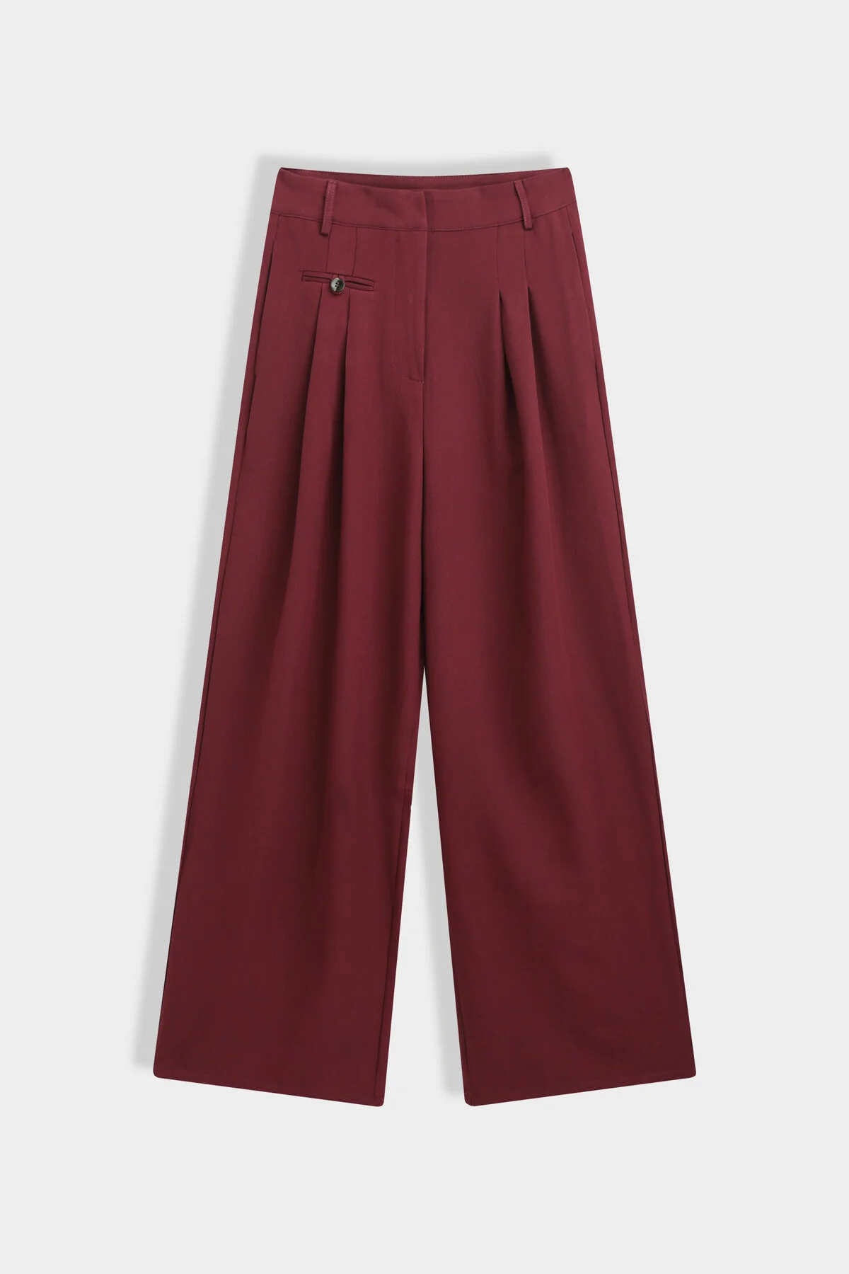 Pantalon taille haute avec pinces structurées à l’avant. Passants pour ceinture. Fermeture par zip dissimulé et agrafes.