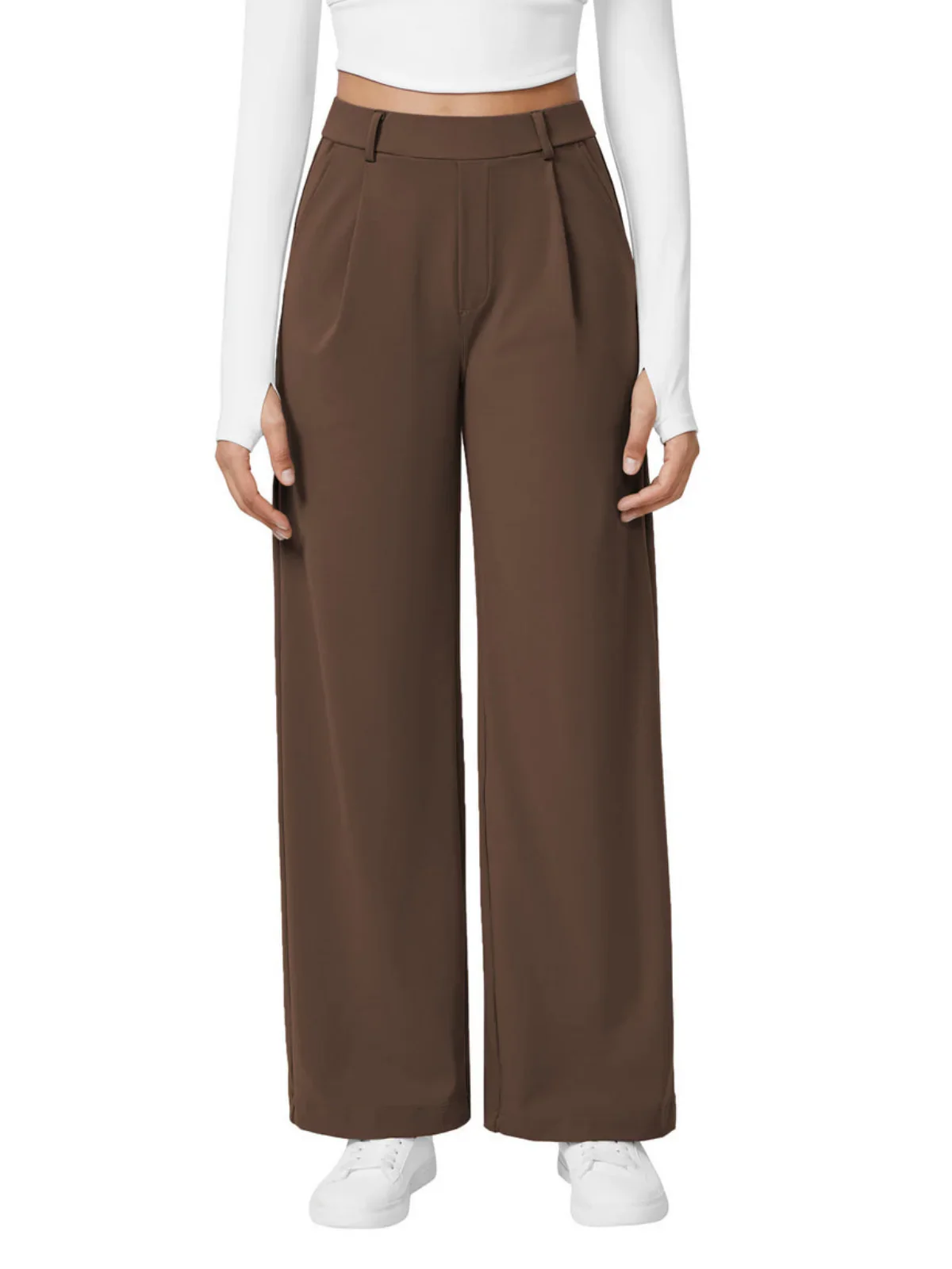 Conception: Pantalon taille haute élégant dans un ton gris doux, doté de jambes larges, de plis sur le devant et d’une ceinture épurée avec passants pour une silhouette raffinée et moderne.