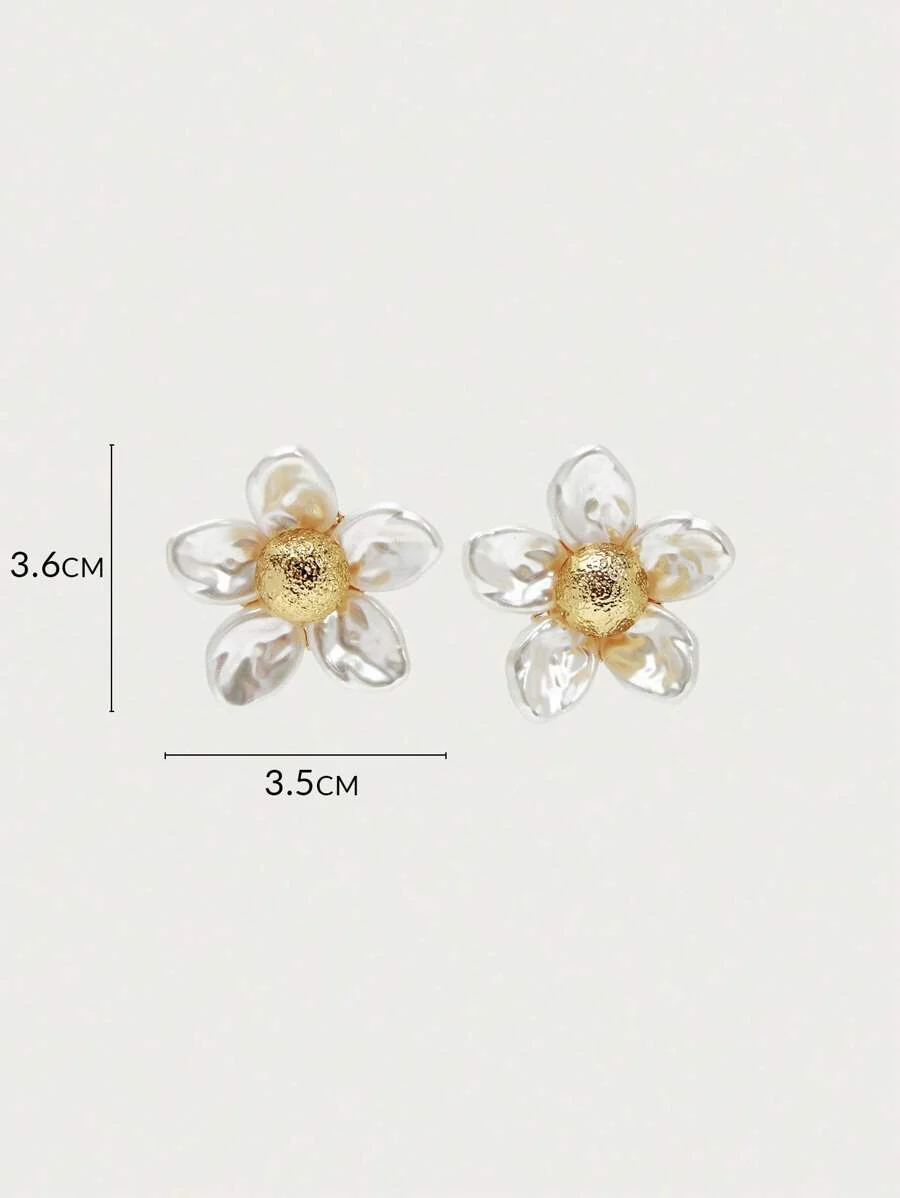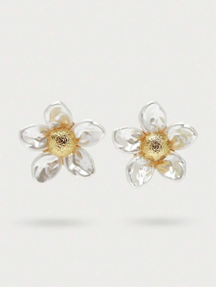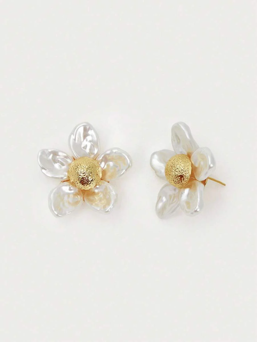 Design: Stud earrings in a delicate flower silhouette; pearl-shell petals radiate from a subtle center for a timeless, elegant aesthetic.