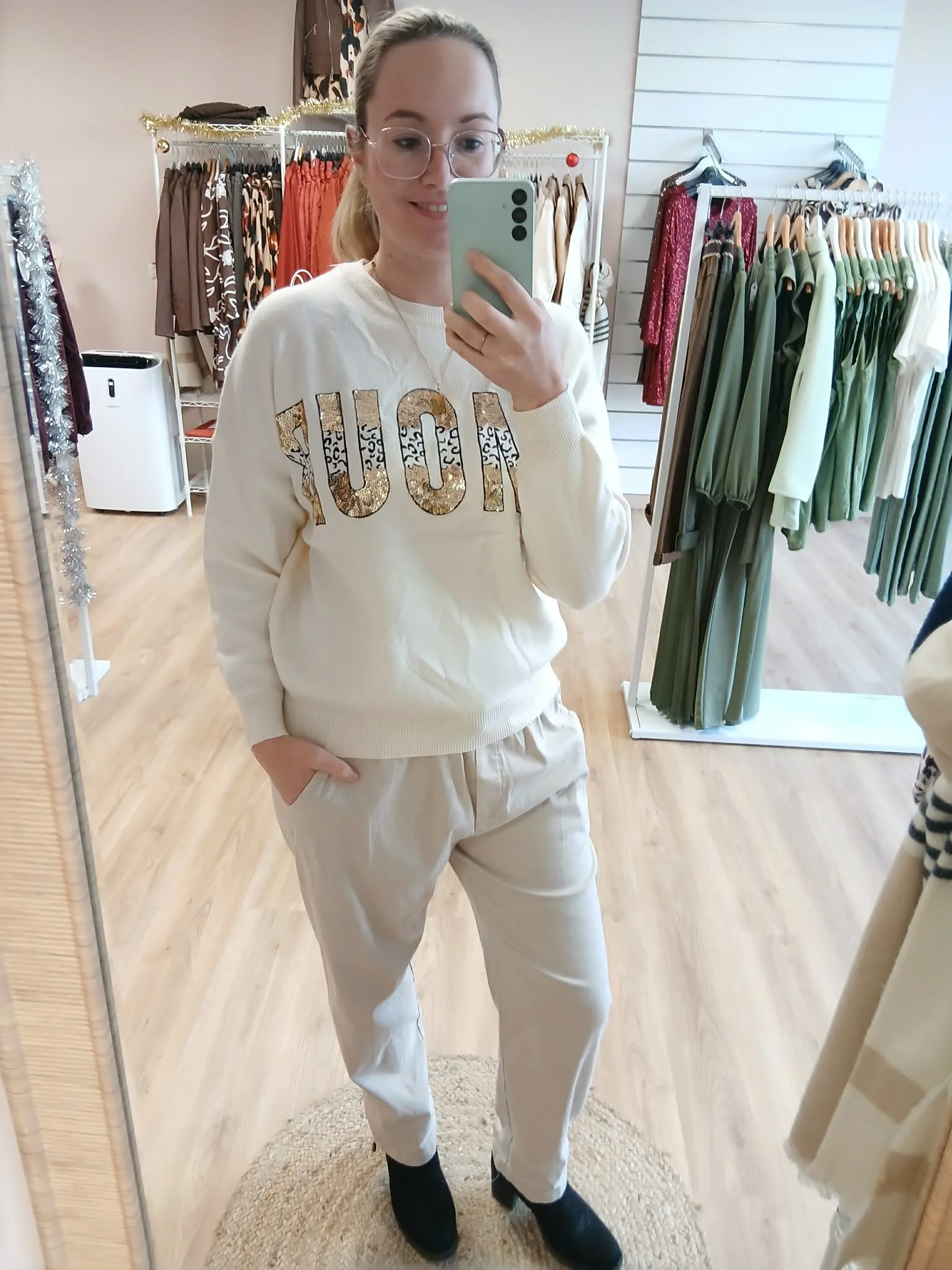 Le Pull Aurélien avec son imprimé AMOUR et ses détails sequins est la pièce statement parfaite pour affirmer votre style. Romantique et tendance, ce pull col rond apporte une touche de glamour à votre quotidien.