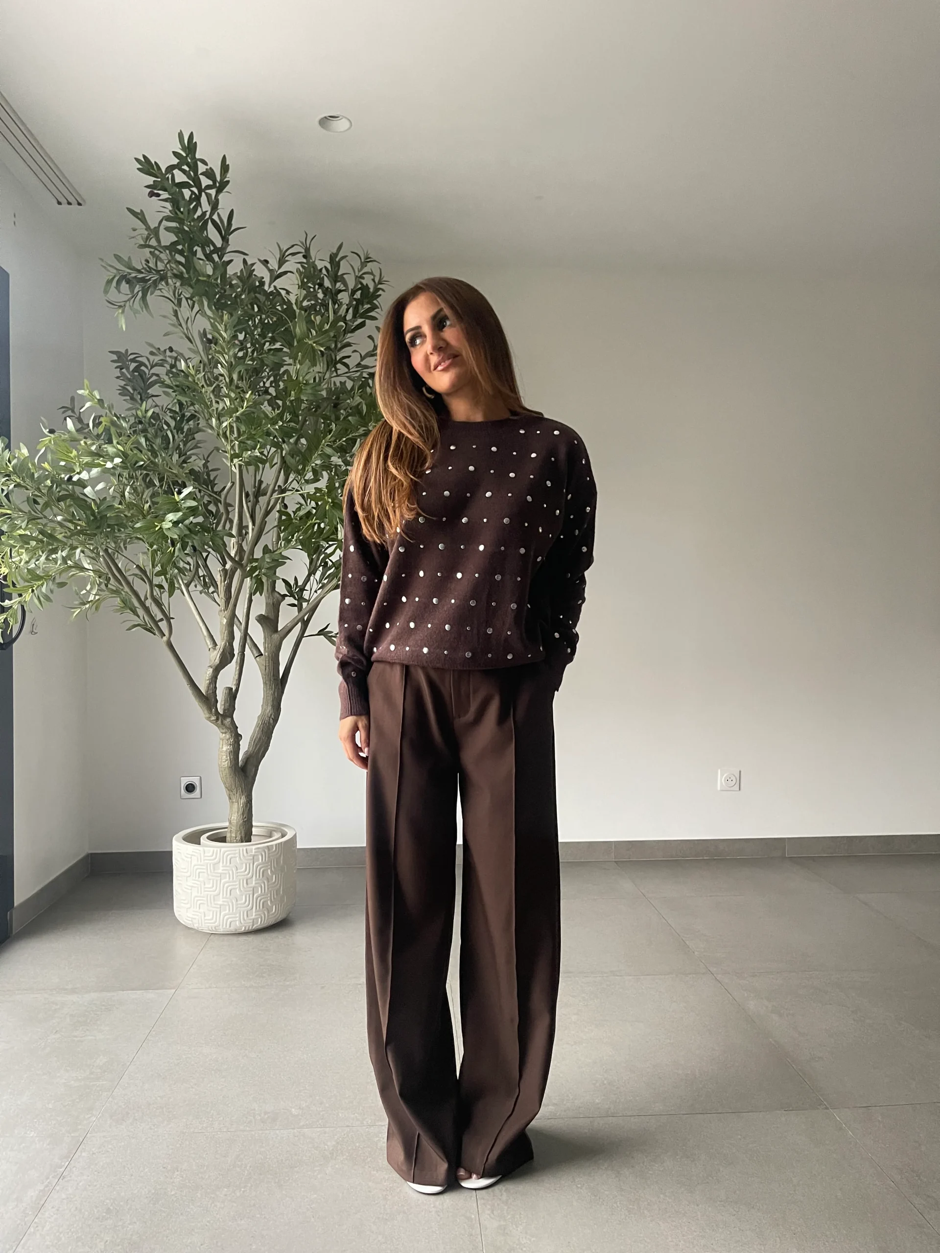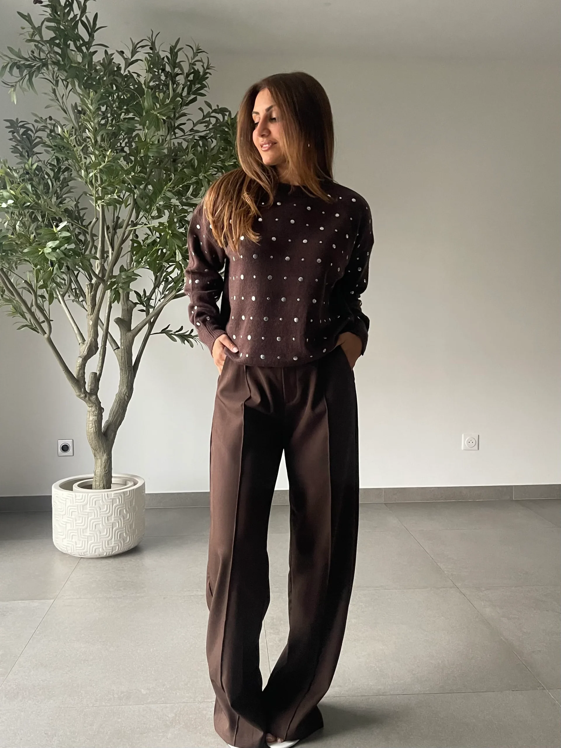 - Pull à pois délicatement brodés, idéal pour apporter une touche graphique et tendance à une tenue du quotidien.
