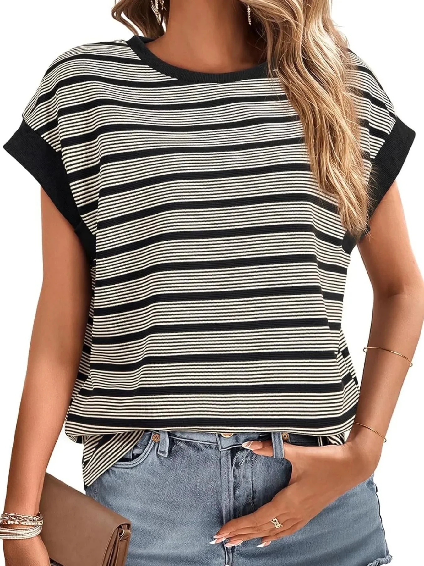 Vous cherchez une blouse fraîche et facile à porter qui ajoute du style à votre look quotidien ? Cette blouse à rayures classiques est le choix parfait. Avec son col rond et ses manches courtes façon mancherons, elle allie confort et élégance décontractée.