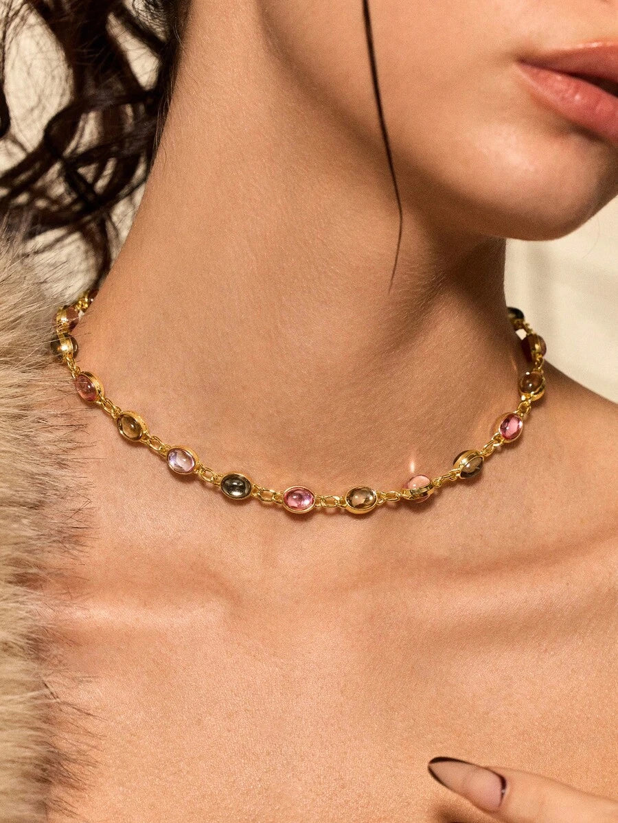 Design: Vintage-inspired chain with a delicate silhouette; rhinestone stations along the chain create a continuous shimmer that frames the neckline with understated glamour.