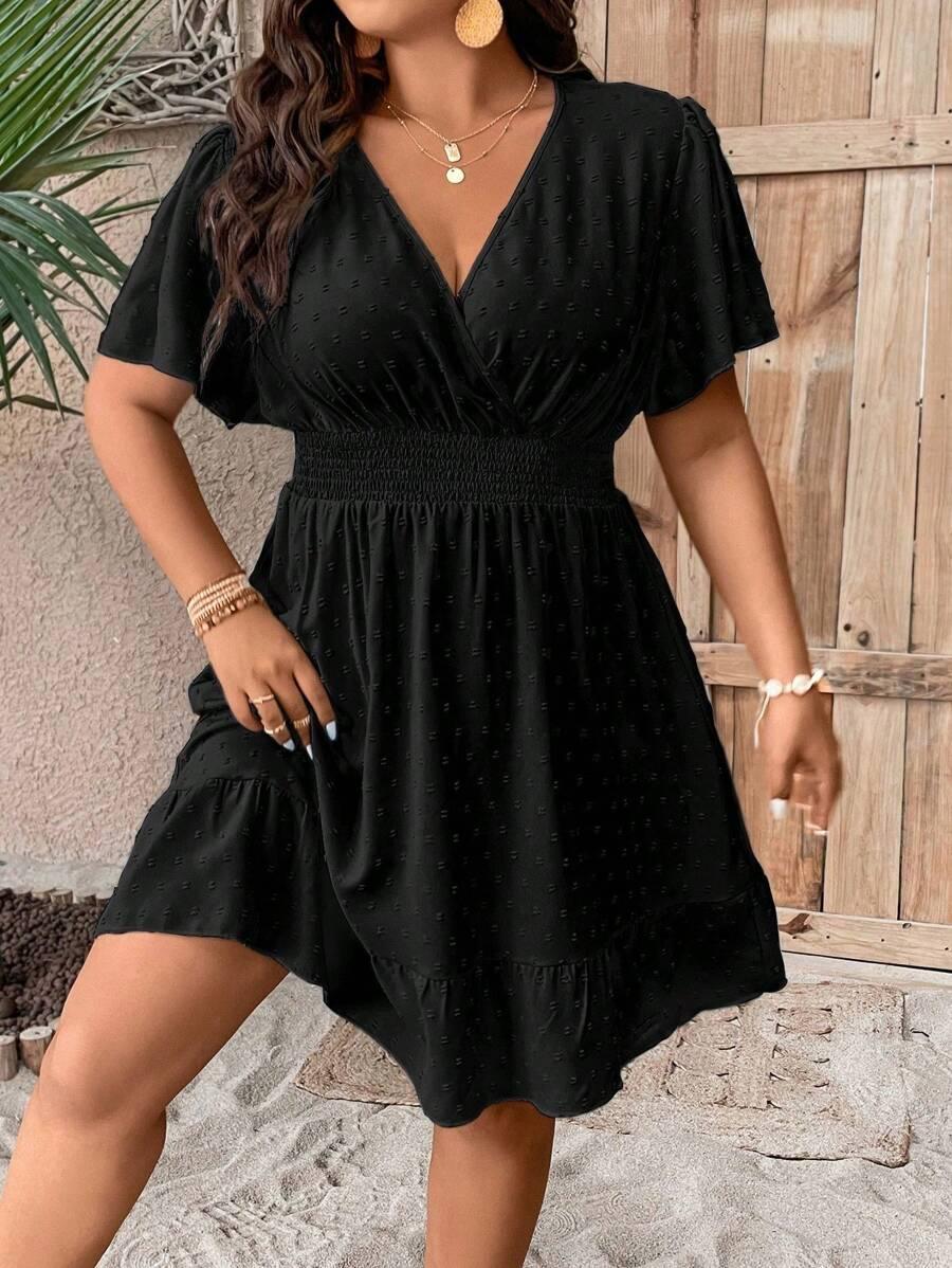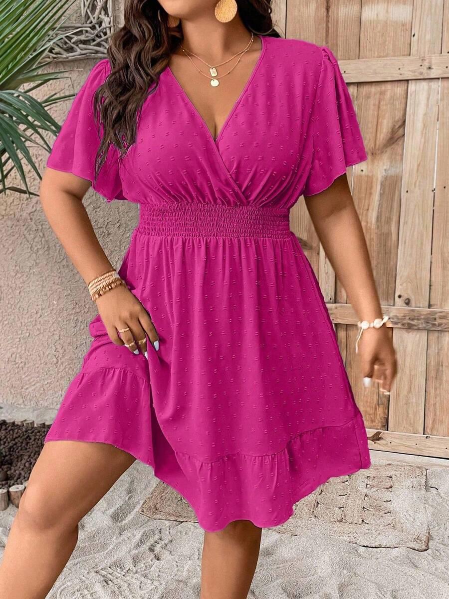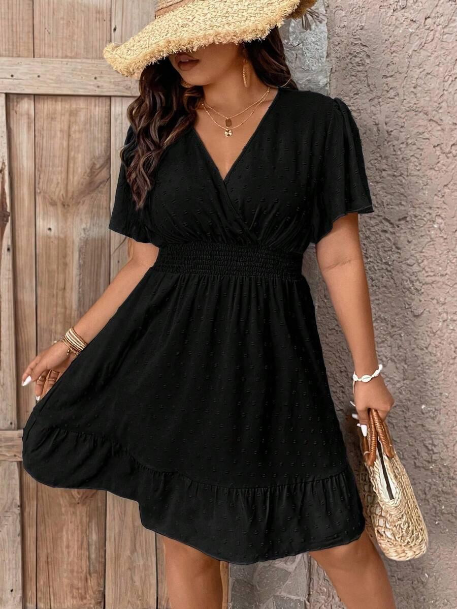Conception: La robe grande taille à col V et volants présente une silhouette trapèze intemporelle avec un décolleté en V cache-cœur et une délicate bordure à volants qui encadre élégamment le décolleté et les manches flottantes, créant une silhouette romantique et féminine. Sa taille cintrée et élastiquée sculpte les courbes, tandis que la jupe fluide drape gracieusement pour une liberté de mouvement et une polyvalence raffinée, en soirée comme au quotidien.