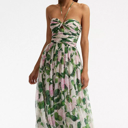 Cette robe longue, légère et aérienne, séduit par son imprimé feuillage aux teintes vertes et roses. Son bustier croisé sublime le décolleté tandis que la découpe subtile à la taille révèle juste ce qu’il faut de peau. Parfaite pour une garden-party, une cérémonie d’été ou une soirée élégante.