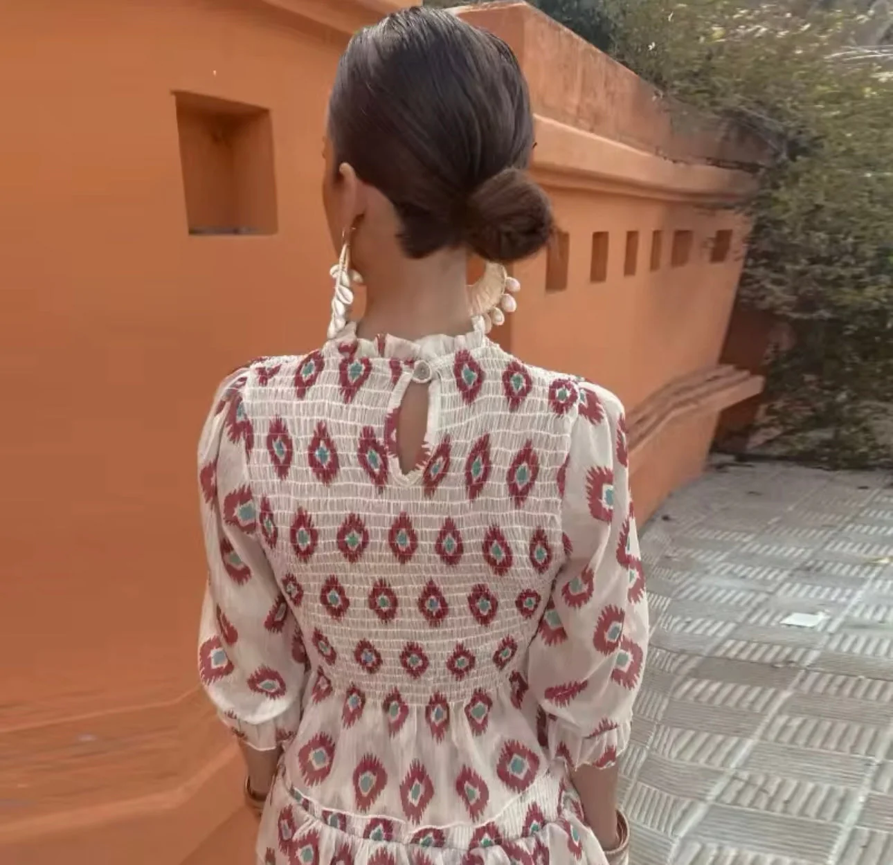 Confectionnée dans un tissu léger, elle séduit par son imprimé géométrique rouge sur fond écru, et par sa coupe fluide. Le col montant apporte une note sophistiquée, tandis que les manches longues légèrement bouffantes ajoutent du charme. La jupe à volants crée un joli mouvement à chaque pas.