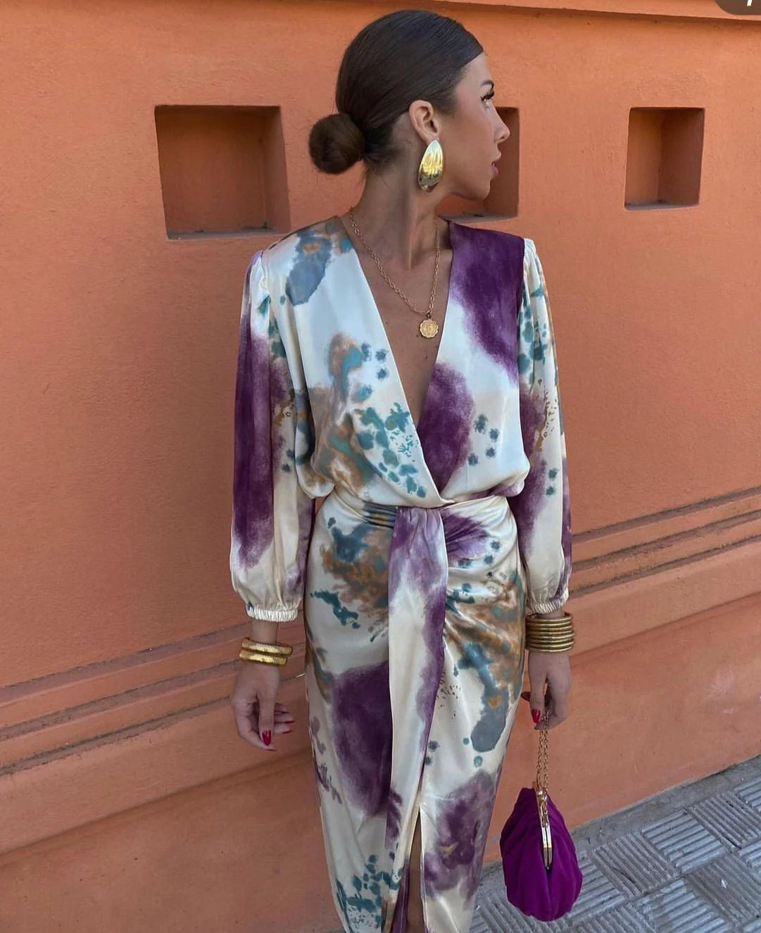 Cette robe portefeuille en satin au motif floral aquarellé dans les tons violet, vert et ivoire évoque une toile peinte à la main. Son tissu soyeux reflète la lumière avec délicatesse, tandis que sa coupe cache-cœur met subtilement la silhouette en valeur.