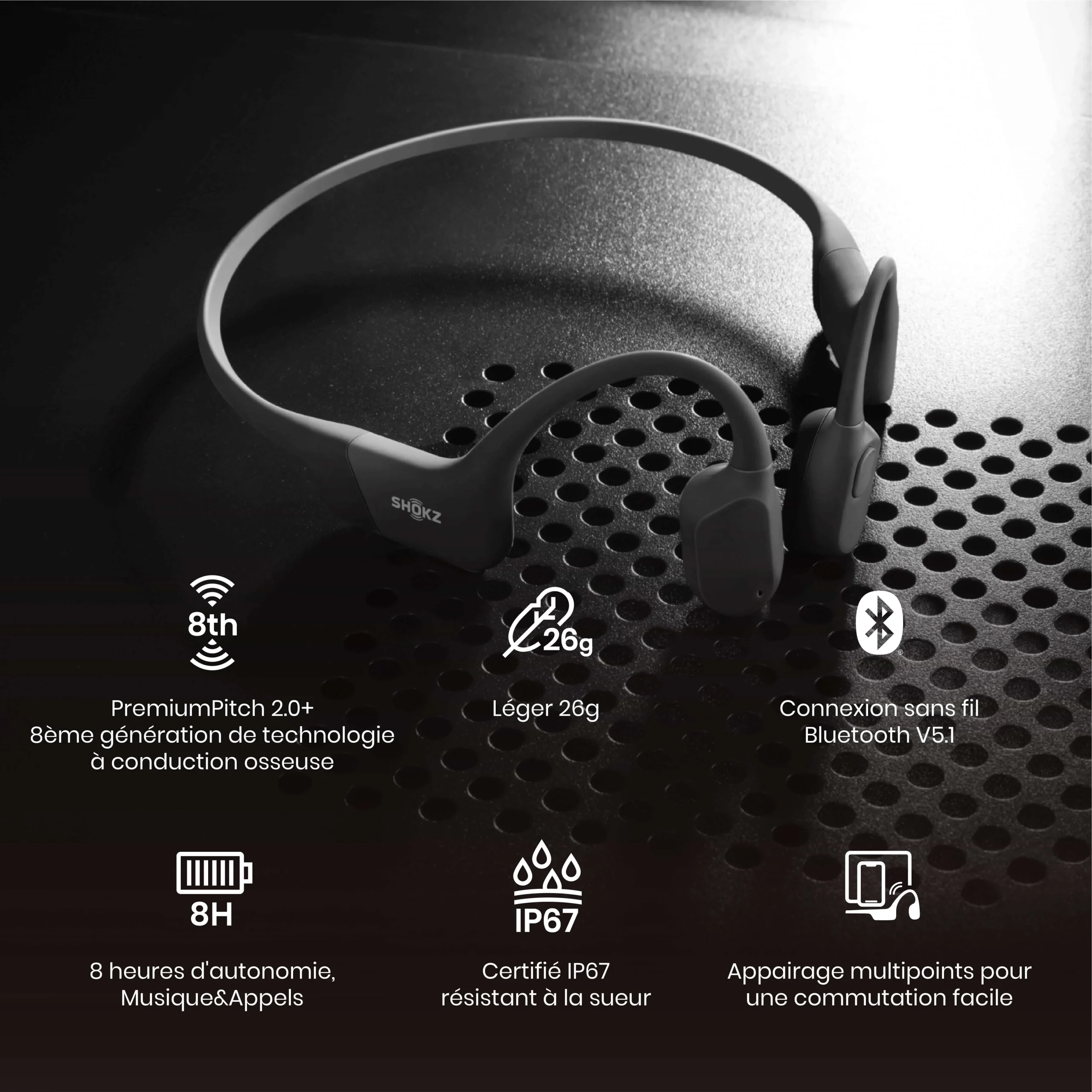 Conception audio : technologie de conduction osseuse de 8ᵉ génération, Bluetooth 5.1, audio PremiumPitch™ 2.0+ pour son clair et volume puissant.