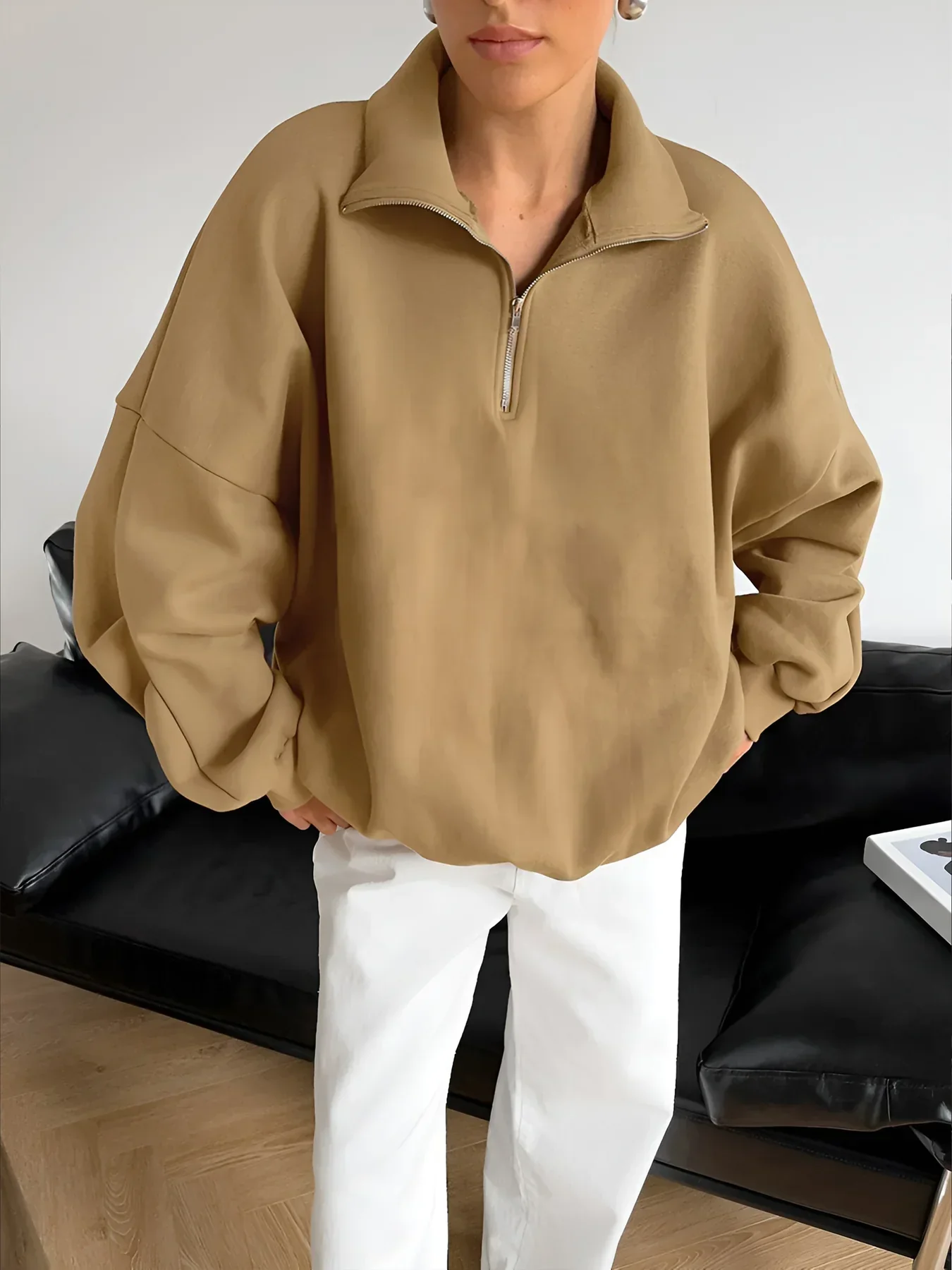 Conception: Un sweat-shirt décontracté et chic, doté d’un revers structuré, d’une fermeture zippée sur le devant et d’une silhouette décontractée. Son design minimaliste offre style et confort en toute simplicité.
