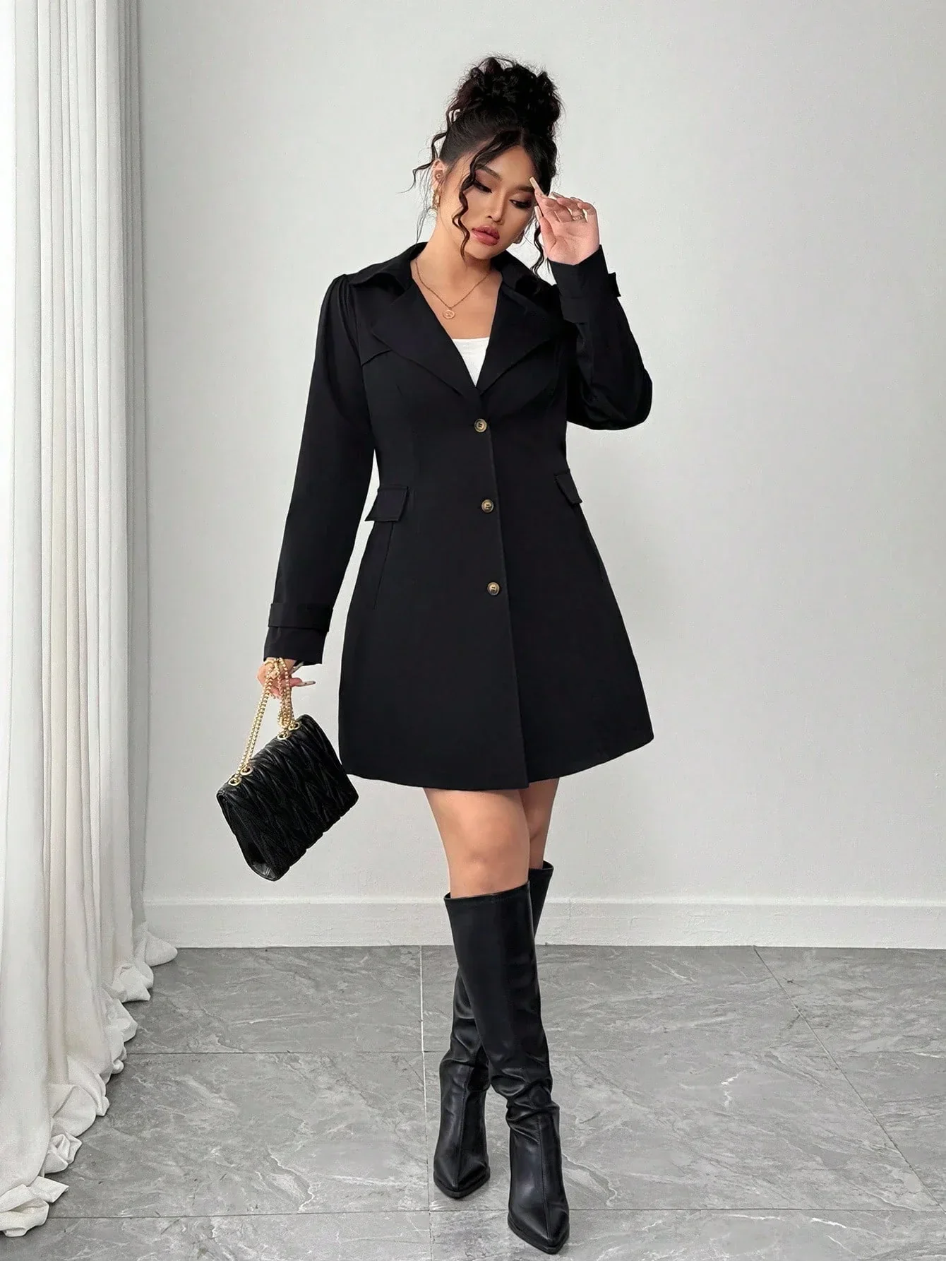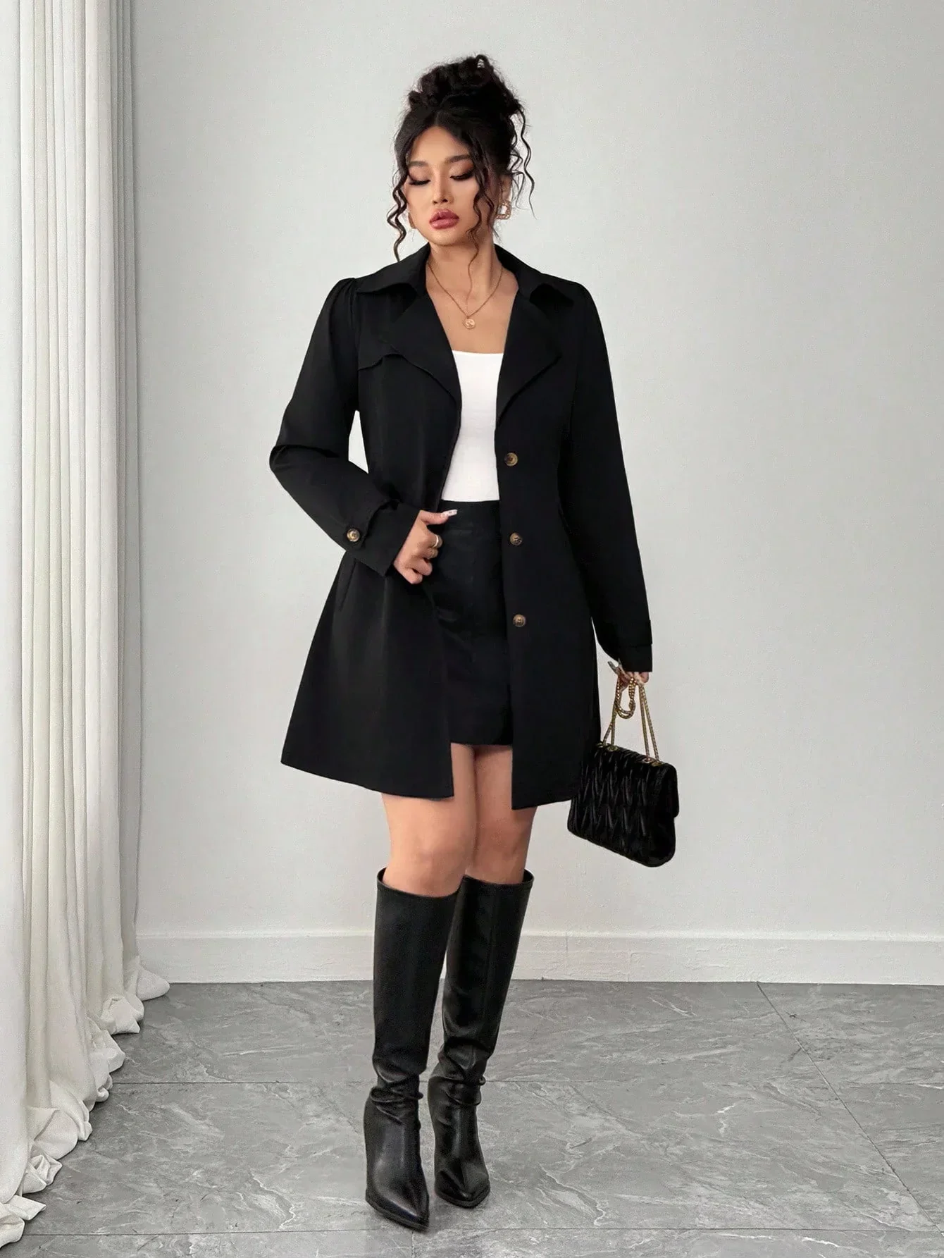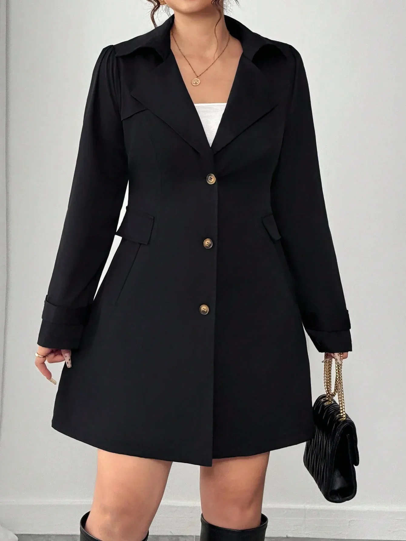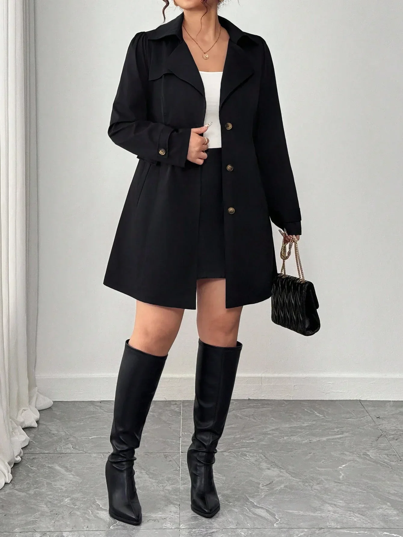 Conception: Ce trench-coat noir grande taille intemporel arbore un revers raffiné et une patte de boutonnage croisée classique qui sublime vos tenues de tous les jours avec une allure soignée. Sa fermeture boutonnée soignée et ses manches aux lignes épurées et régulières sculptent une silhouette flatteuse qui sublime les courbes tout en conservant une silhouette élégante et raffinée.