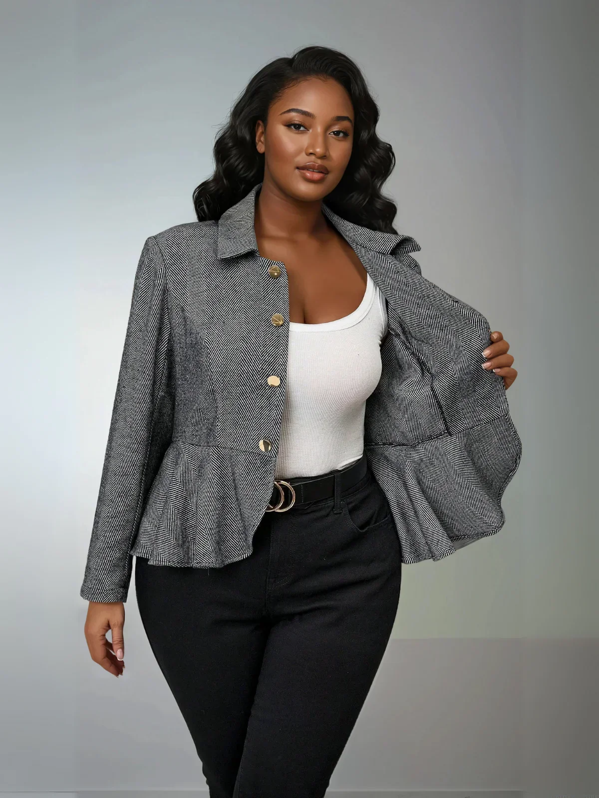 Conception: Une veste chic à chevrons grande taille alliant style classique et style contemporain. Son colorblock noir et blanc intemporel sublime toutes vos tenues. Sa silhouette ouverte crée une ligne flatteuse et met en valeur la silhouette, tandis que sa doublure et sa coupe subtile offrent une structure raffinée et une superposition facile pour les […]