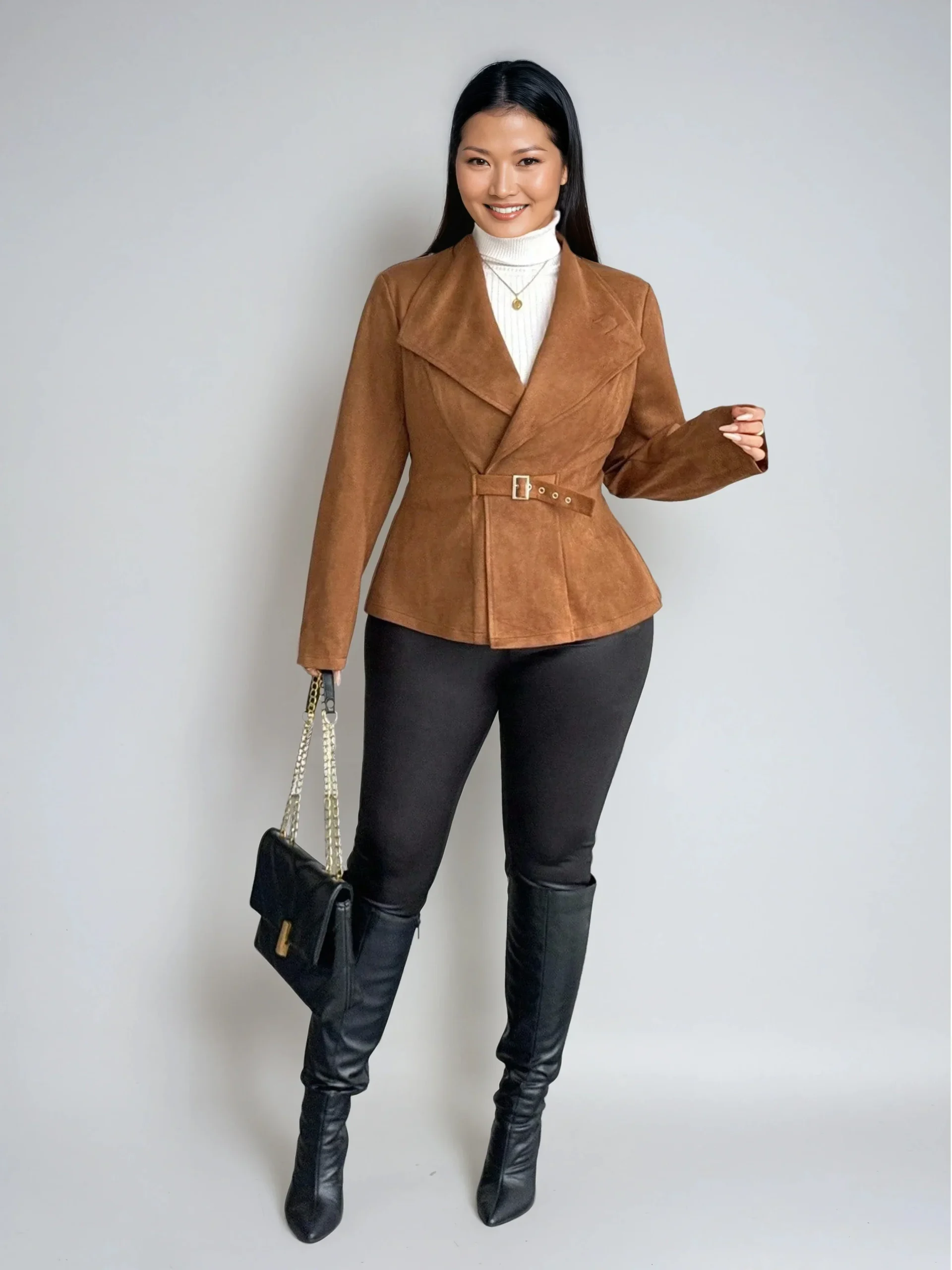 Conception: Une veste chic grande taille en imitation daim avec ceinture, dotée d’une élégante encolure cascade et d’un ourlet évasé, qui apporte mouvement et élégance moderne à chaque pas. Ses manches longues et sa taille cintrée, rehaussée d’une ceinture du même tissu, créent une silhouette raffinée alliant aisance décontractée et structure soignée, idéale pour les superpositions en toute saison.