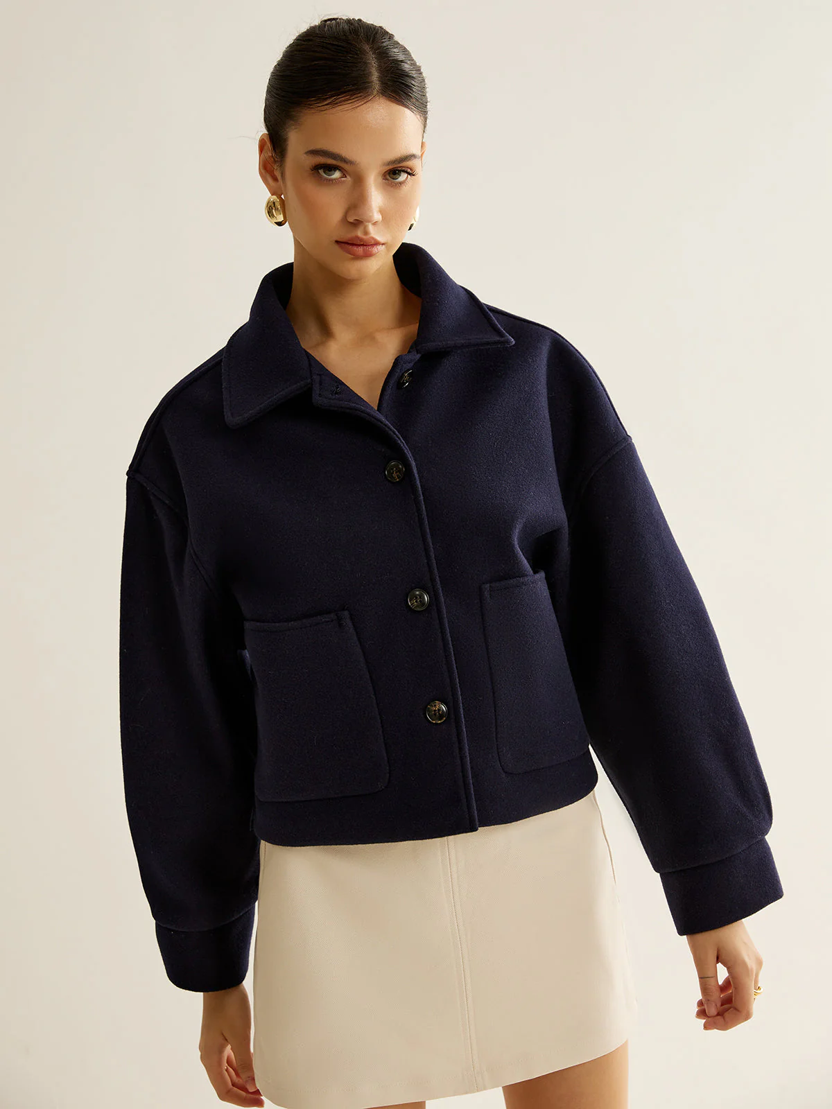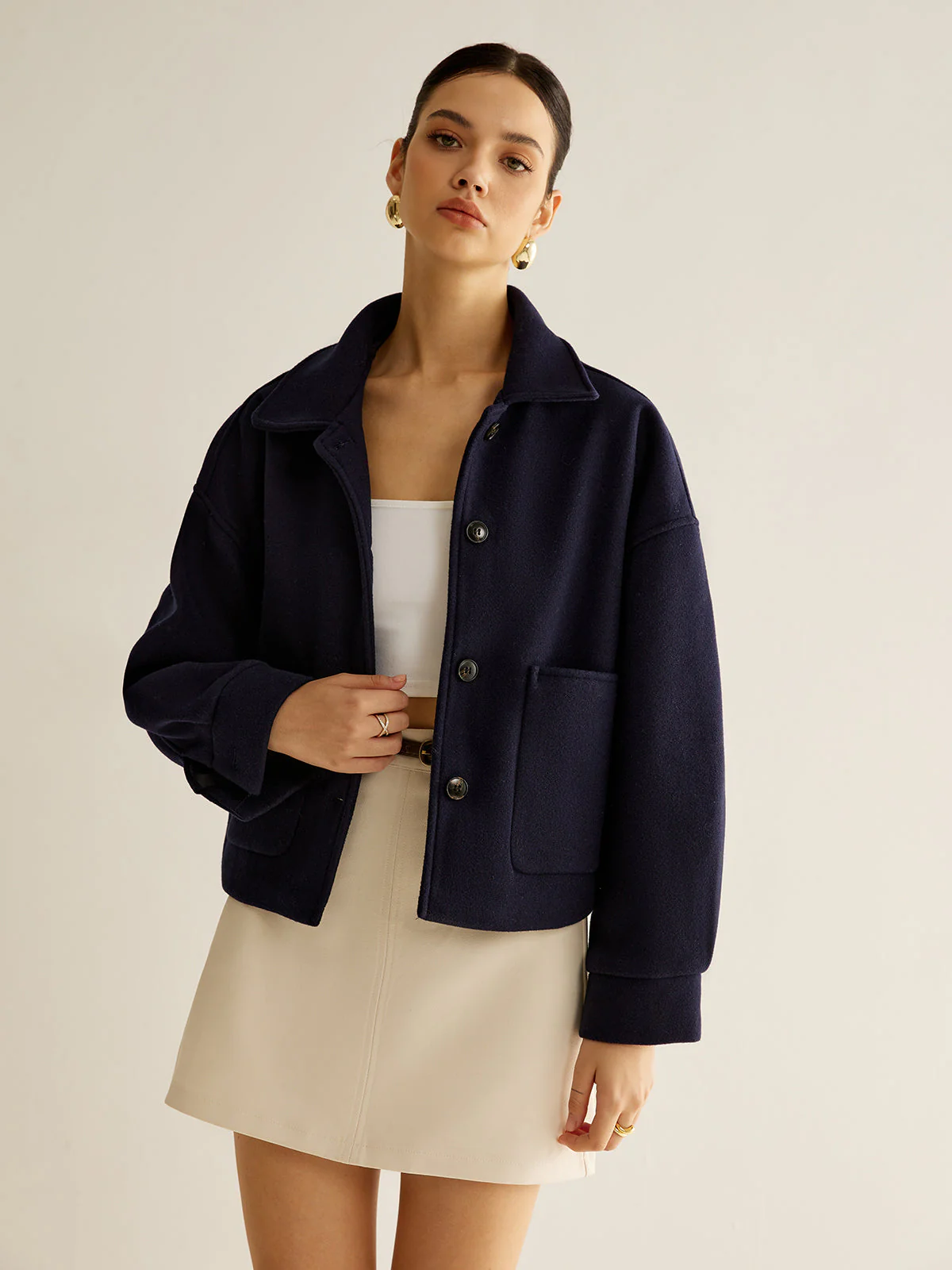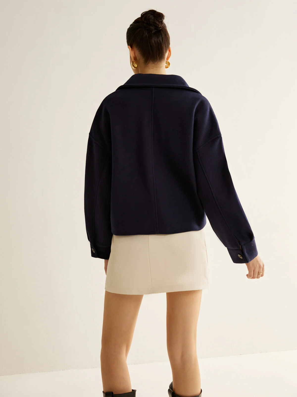 Cette veste courte bleu marine se distingue par son design minimaliste et sa coupe légèrement ample. Parfaite pour la mi-saison, elle apporte une touche sophistiquée et décontractée à toutes vos tenues.