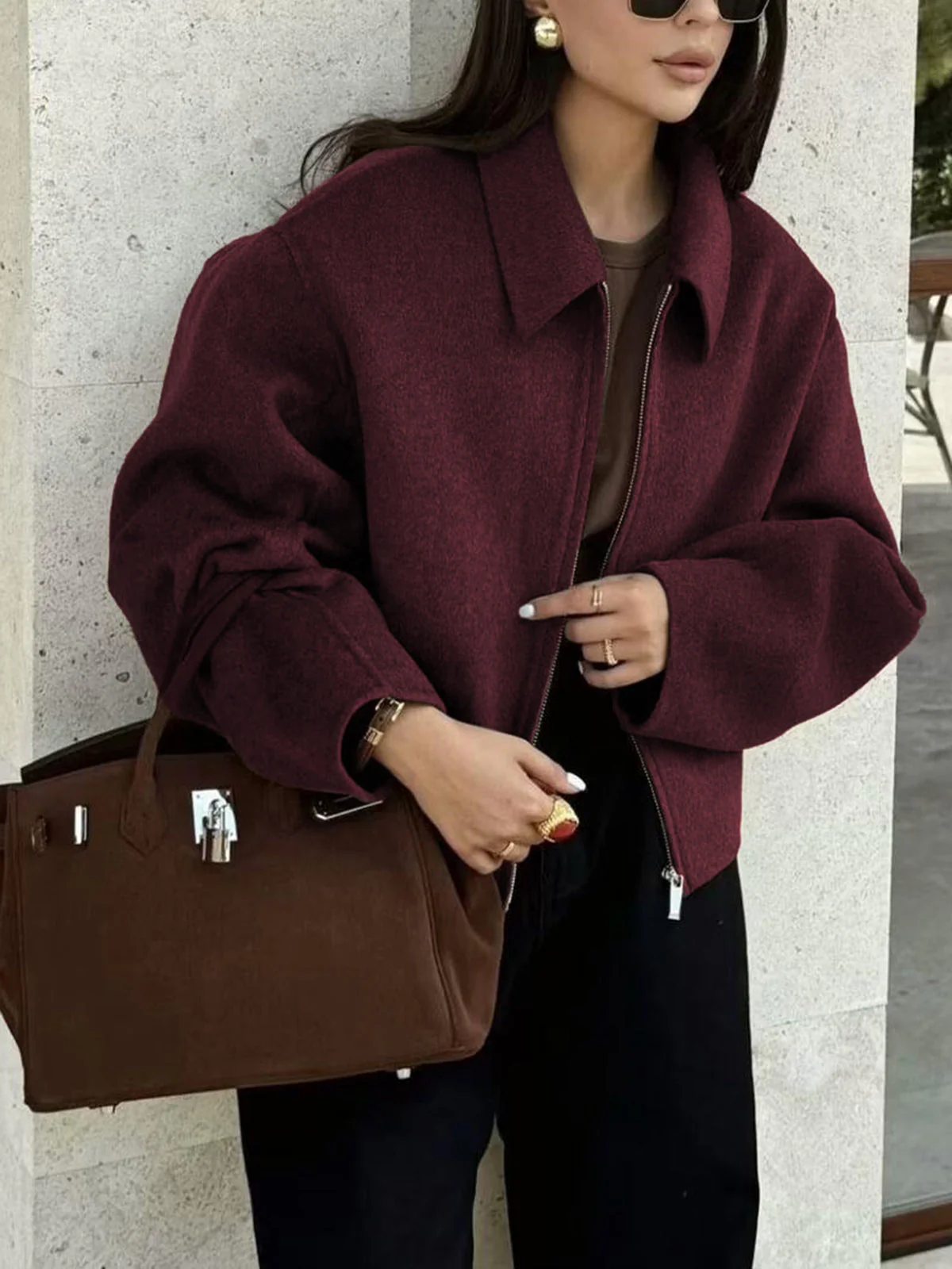 Cette veste courte en laine mélangée est un incontournable de votre garde-robe d’hiver. Avec sa coupe ample et ses tons riches, elle offre une allure chic tout en assurant votre confort lors des journées fraîches.