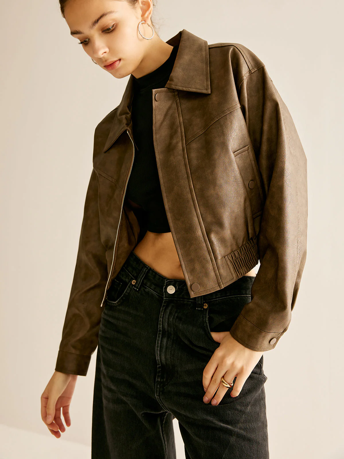 Cette veste courte marron combine un style minimaliste avec une touche vintage grâce à sa texture suédée. Sa coupe ajustée et son col classique ajoutent une dose de sophistication à vos tenues quotidiennes.