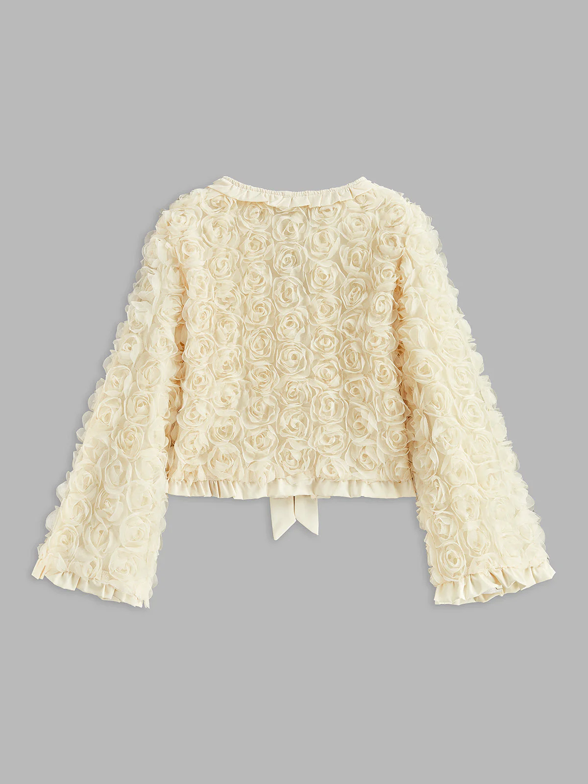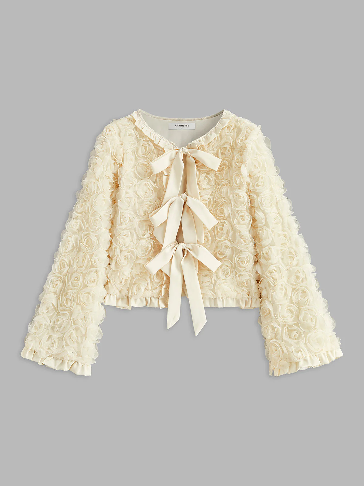 Cette veste courte ornée de motifs floraux en relief et nouée par des rubans satinés est idéale pour une occasion spéciale ou pour ajouter une touche romantique à votre look.