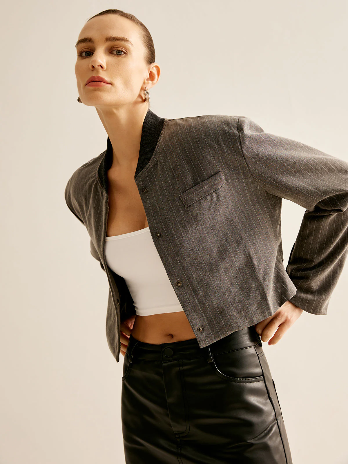 Cette veste grise à rayures est un essentiel pour un style raffiné et audacieux. Avec sa coupe courte et ses détails subtils, elle est idéale pour une allure chic et minimaliste.