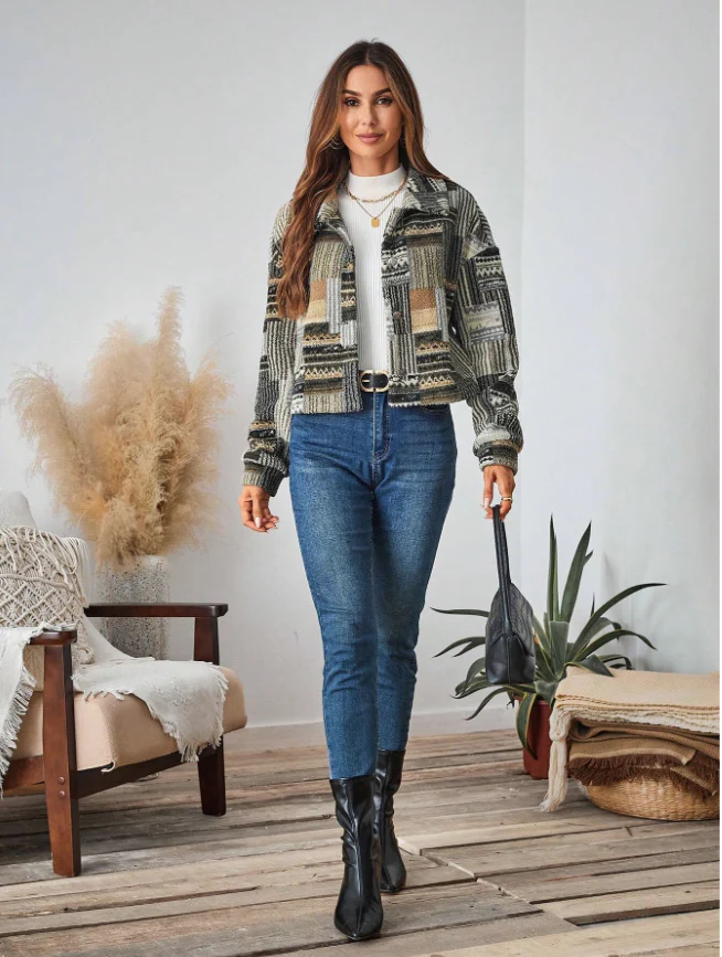 Ajoutez une touche d’originalité à vos looks avec cette veste courte patchwork, à l’esprit bohème et moderne.