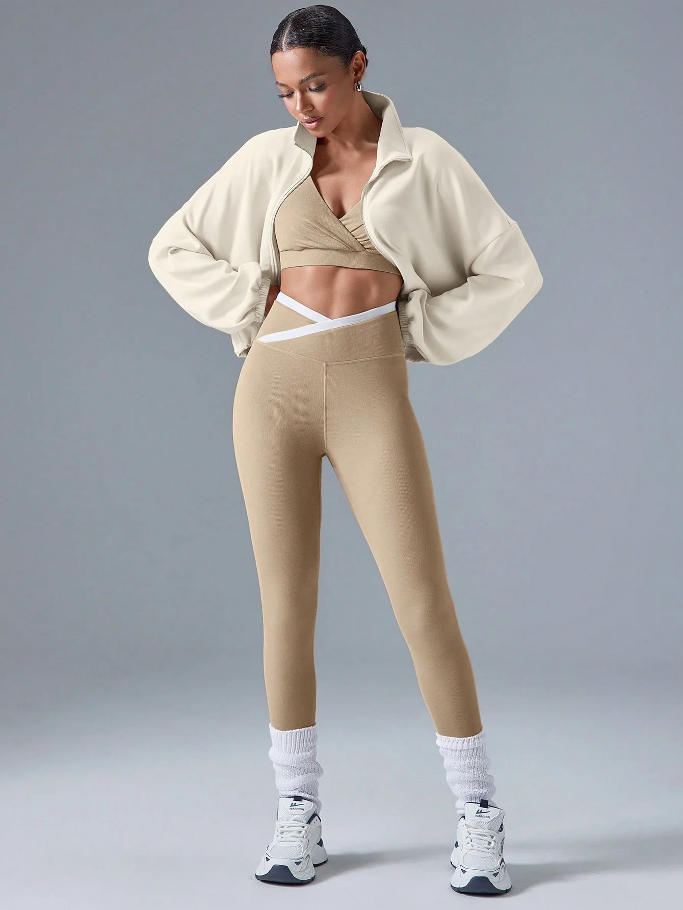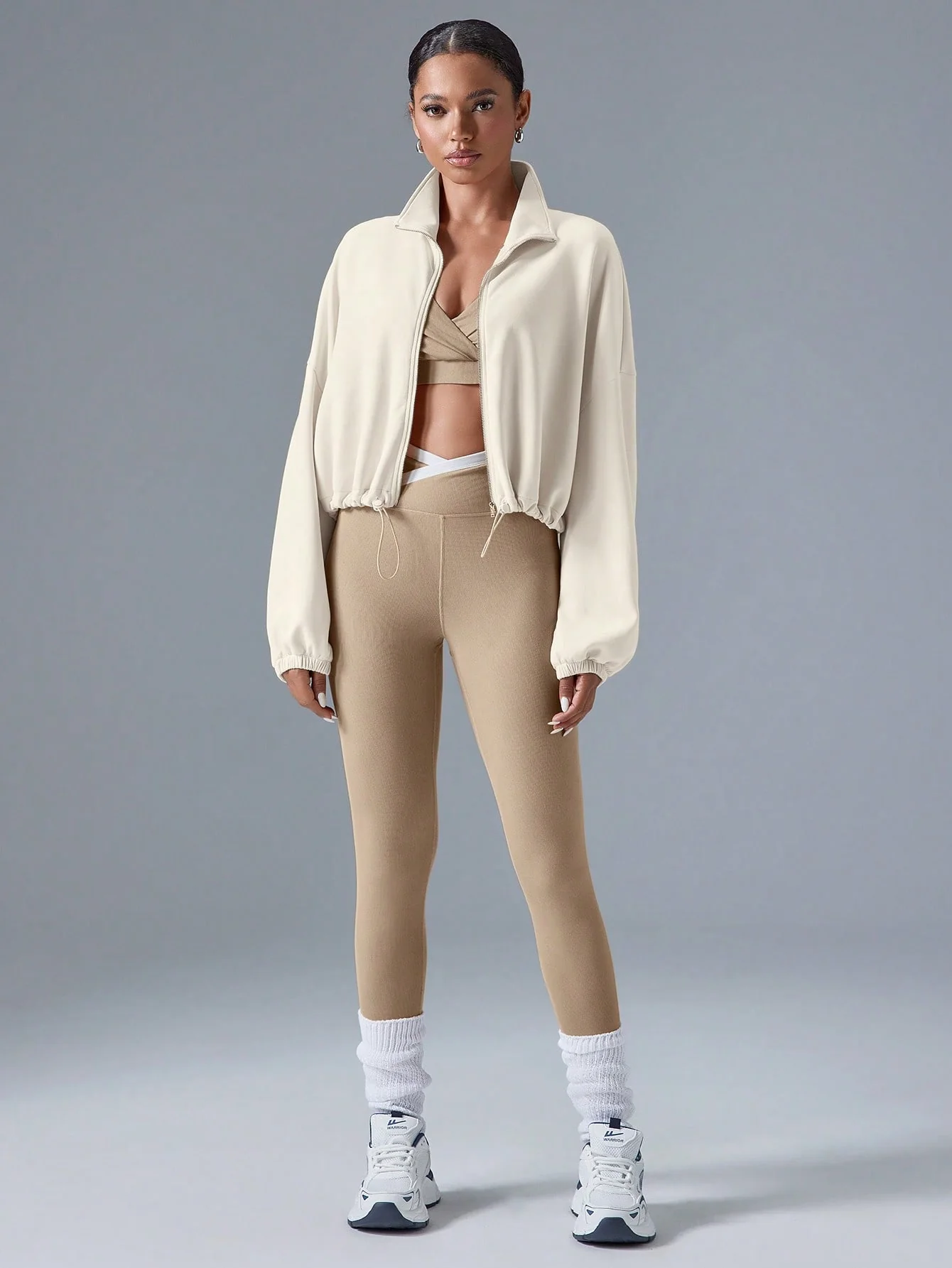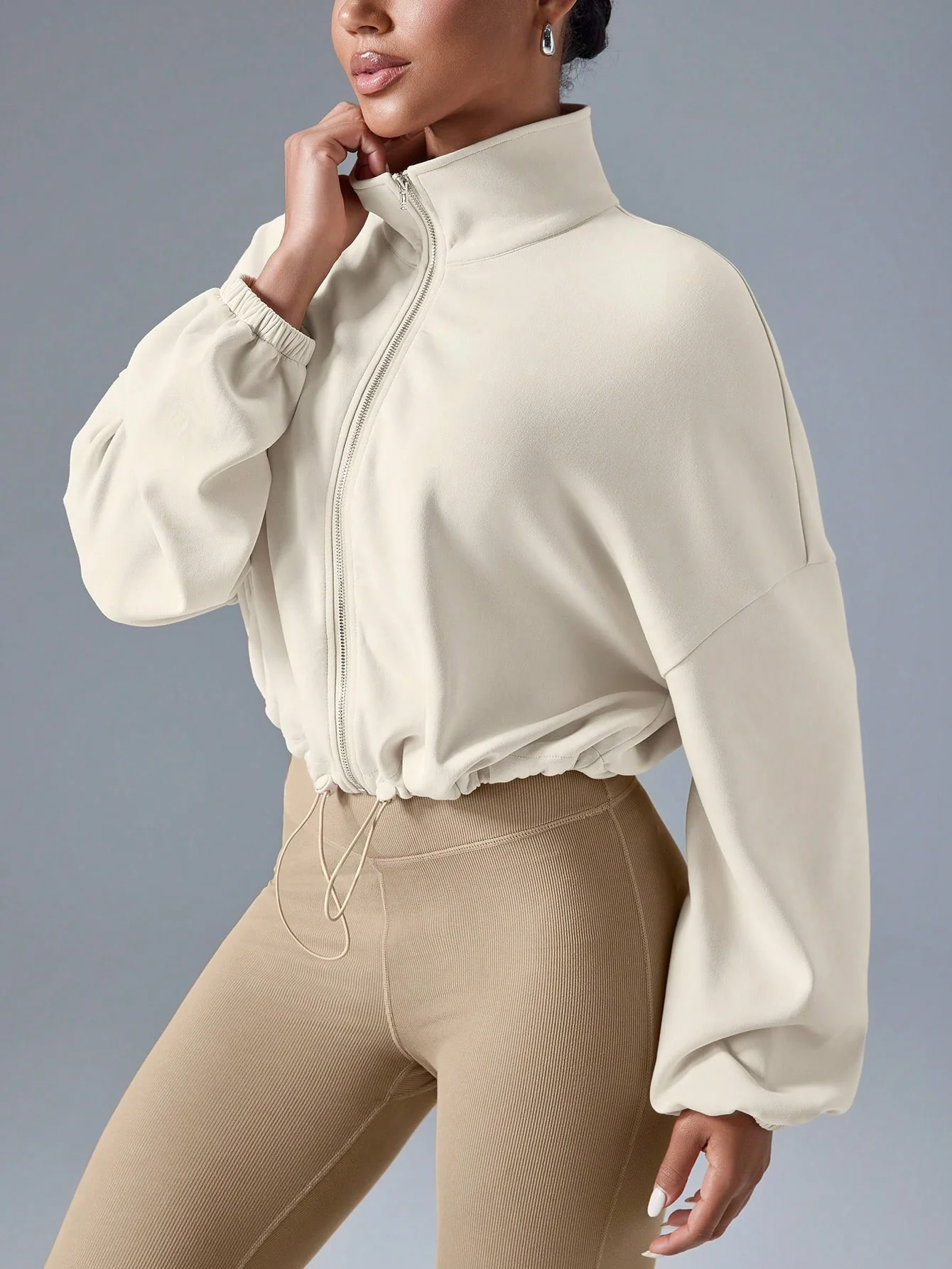 Veste courte zippée pour femme avec col montant et poches, légère et sportive, idéale pour les activités de plein air.