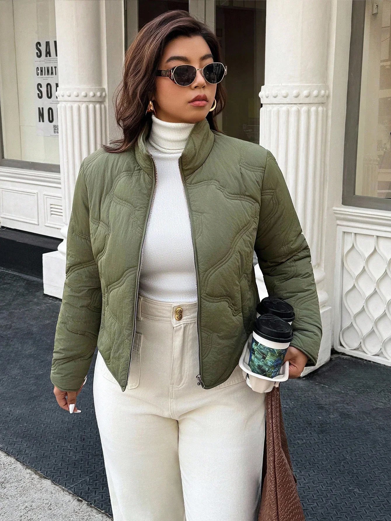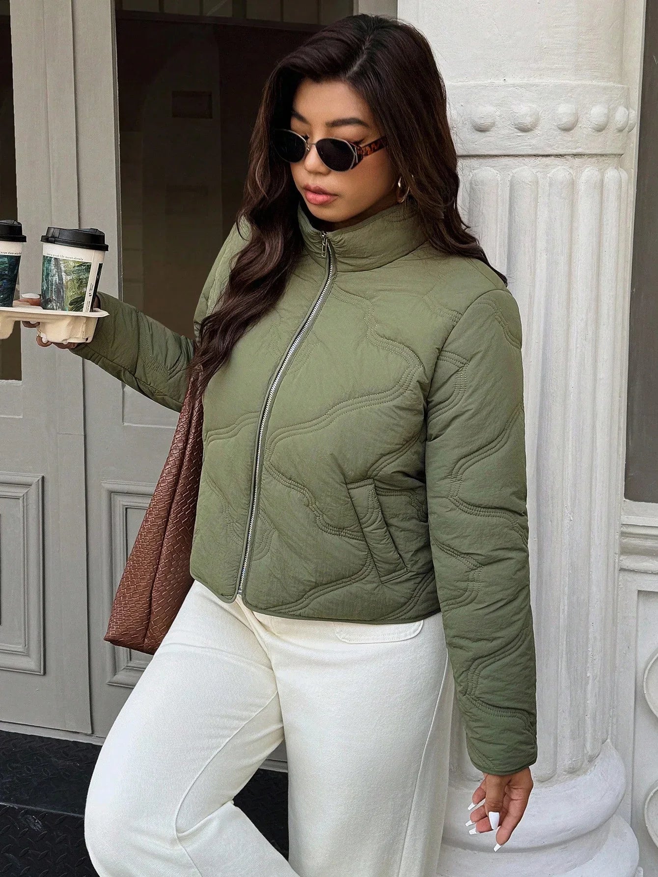 Conception: Une veste décontractée chic et grande taille, dotée d’une élégante patte de boutonnage zippée, d’un corps matelassé et de poches plaquées pratiques pour une silhouette moderne et confortable. Son col cheminée et ses manches longues classiques créent une couche extérieure courte et raffinée qui allie lignes structurées et aisance au quotidien.