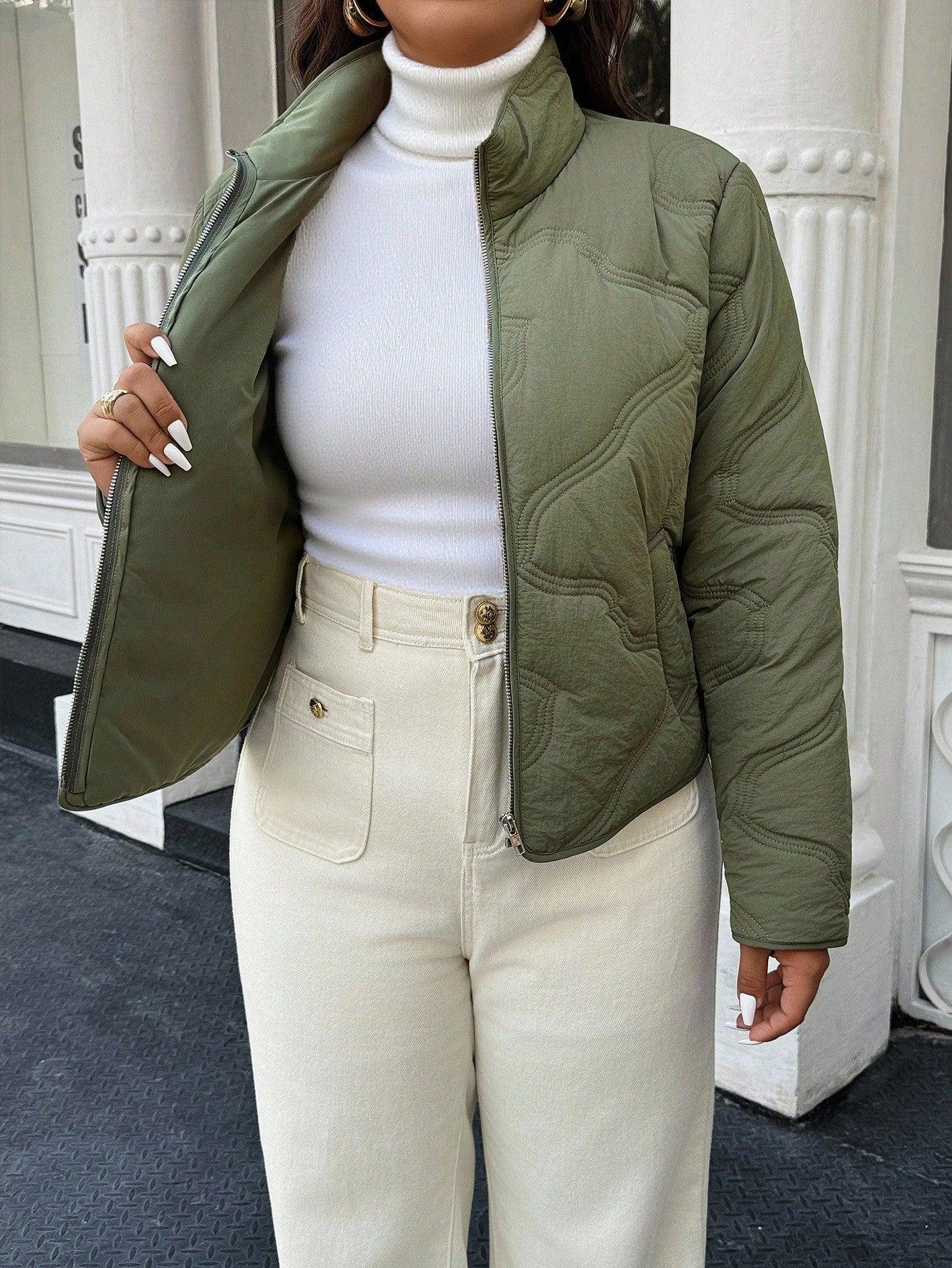 Veste d’hiver grande taille à fermeture éclair sur le devant, doublure verte unie