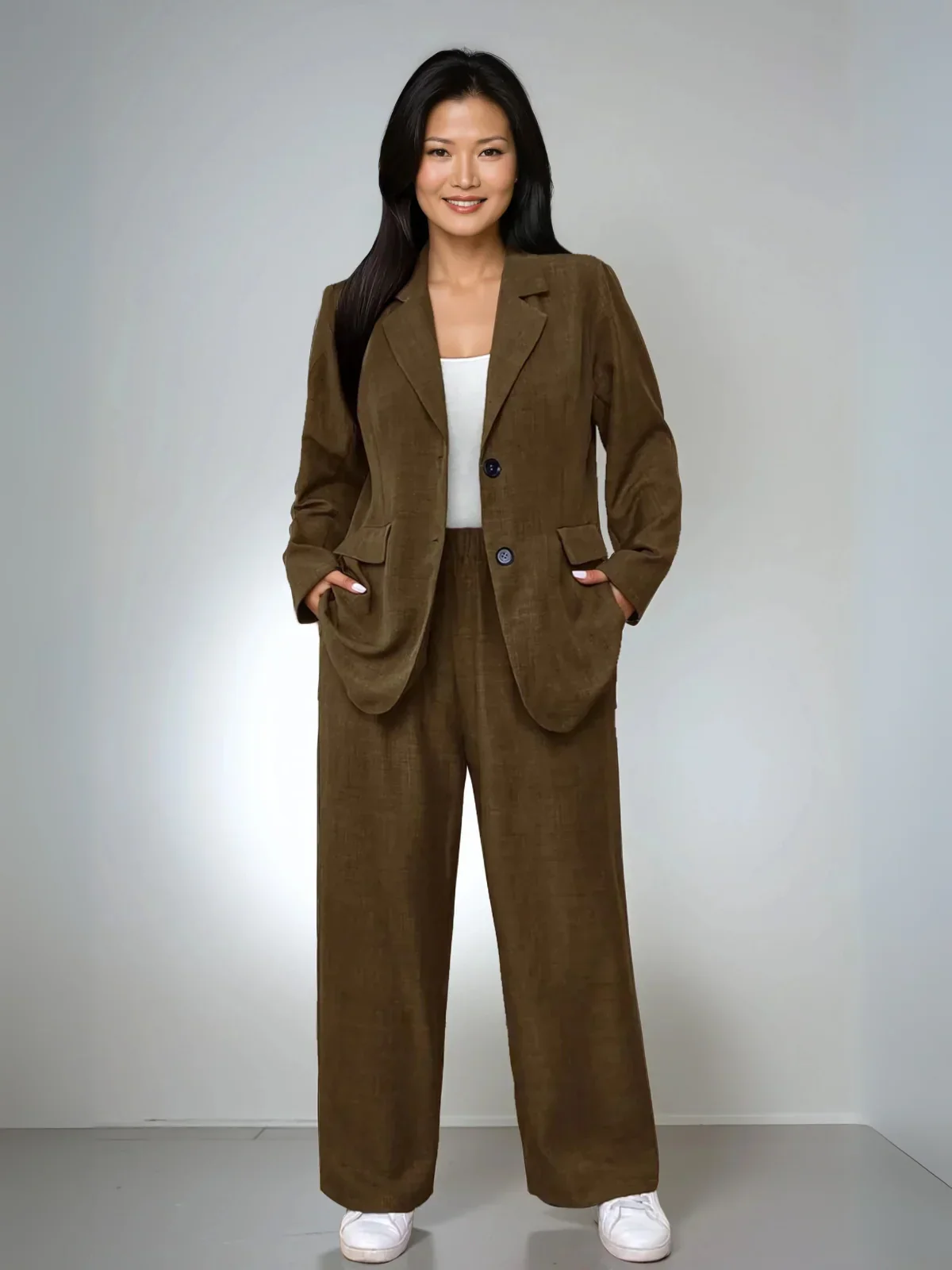 Conception: Ensemble de costume deux pièces sophistiqué comprenant une veste à revers structurée associée à un pantalon droit sur mesure, créant une silhouette raffinée.
